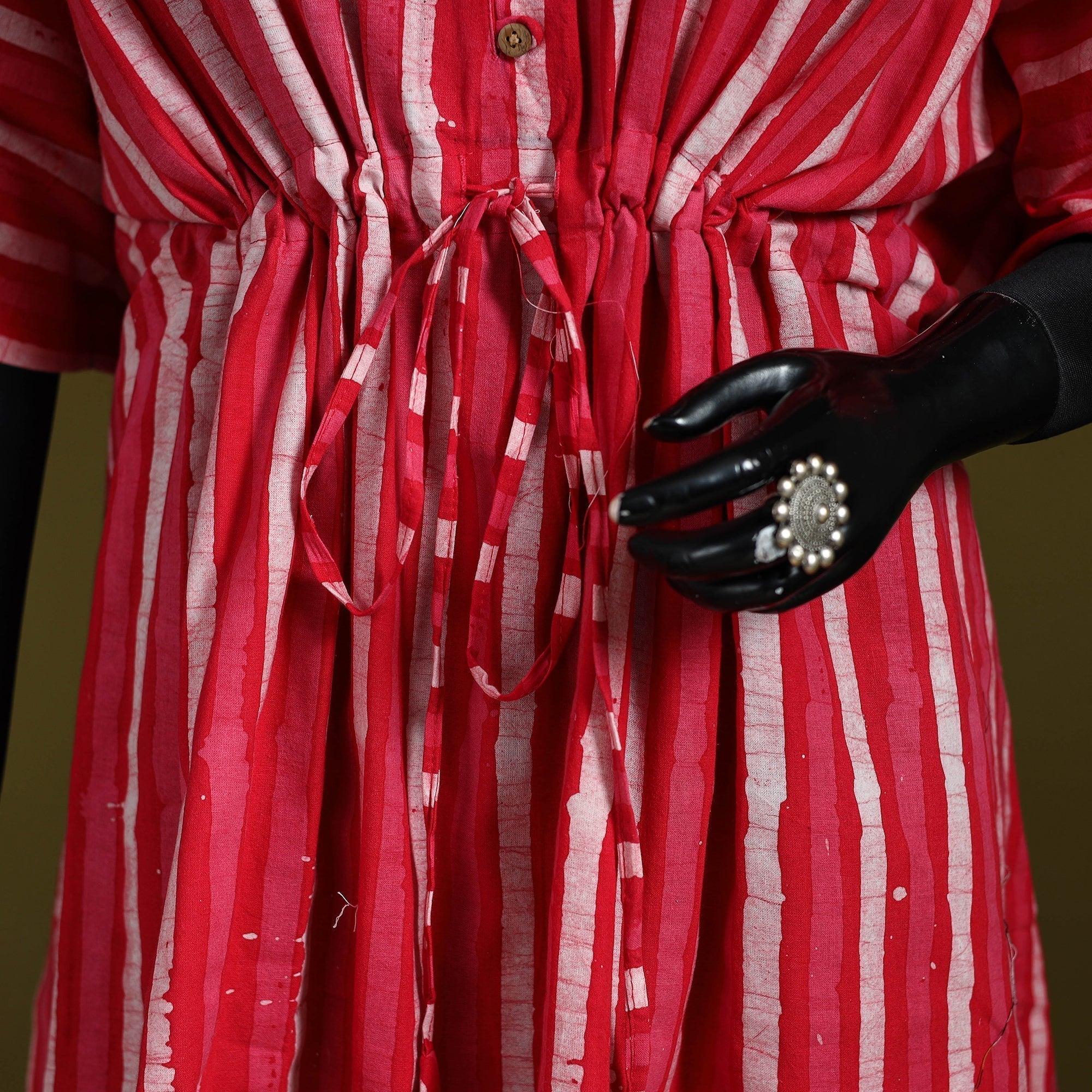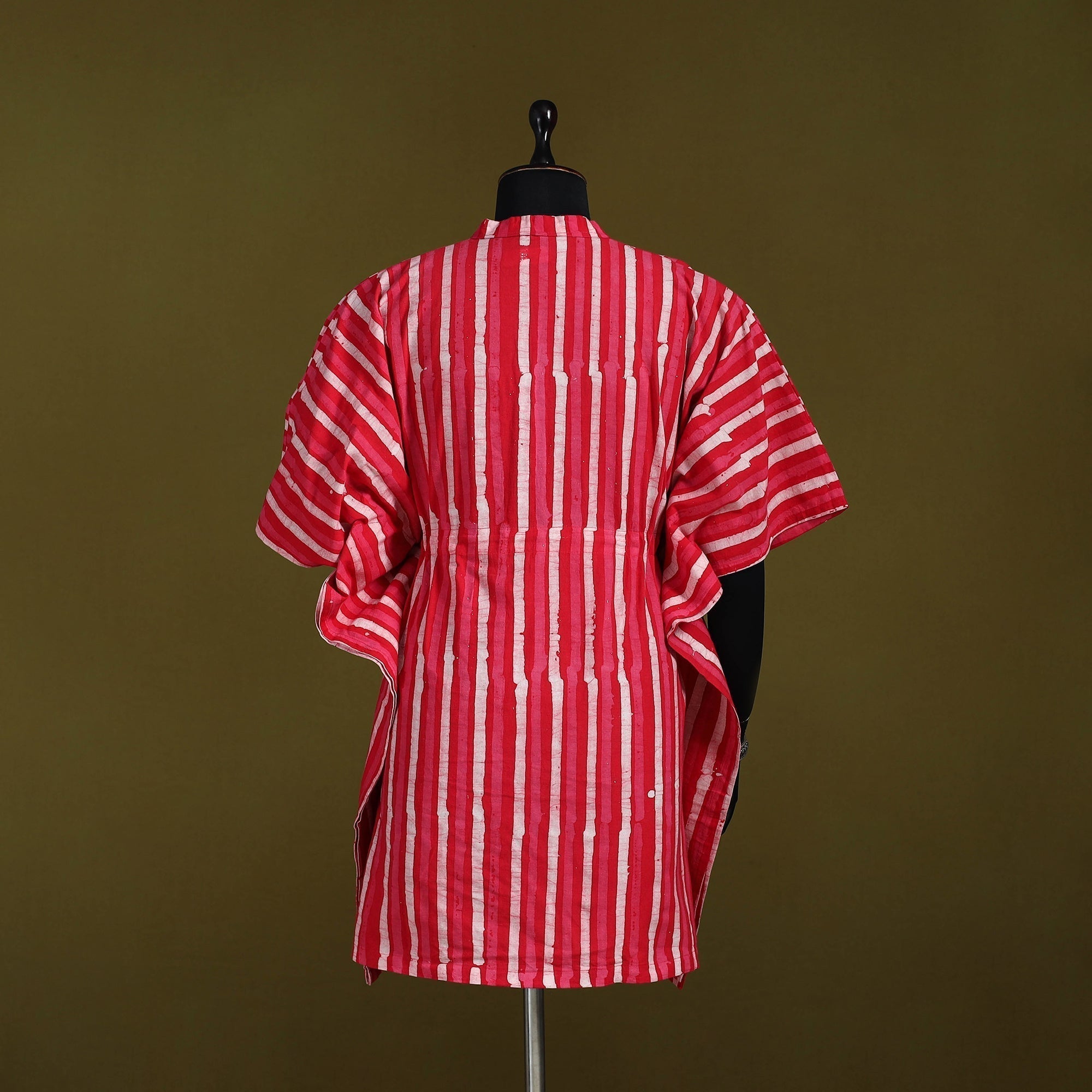 | Material | Red hand block batik print medium cotton kaftan created using the traditional wax-resist dyeing technique, a craft believed to be over 2,000 years old and known for its bold patterns and signature crackle effect. Made from breathable cotton, this kaftan features flowing sleeves and a drawstring waist tie that lets you adjust the fit to suit your shape. Perfect for relaxed lounging at home or easygoing casual outings. |