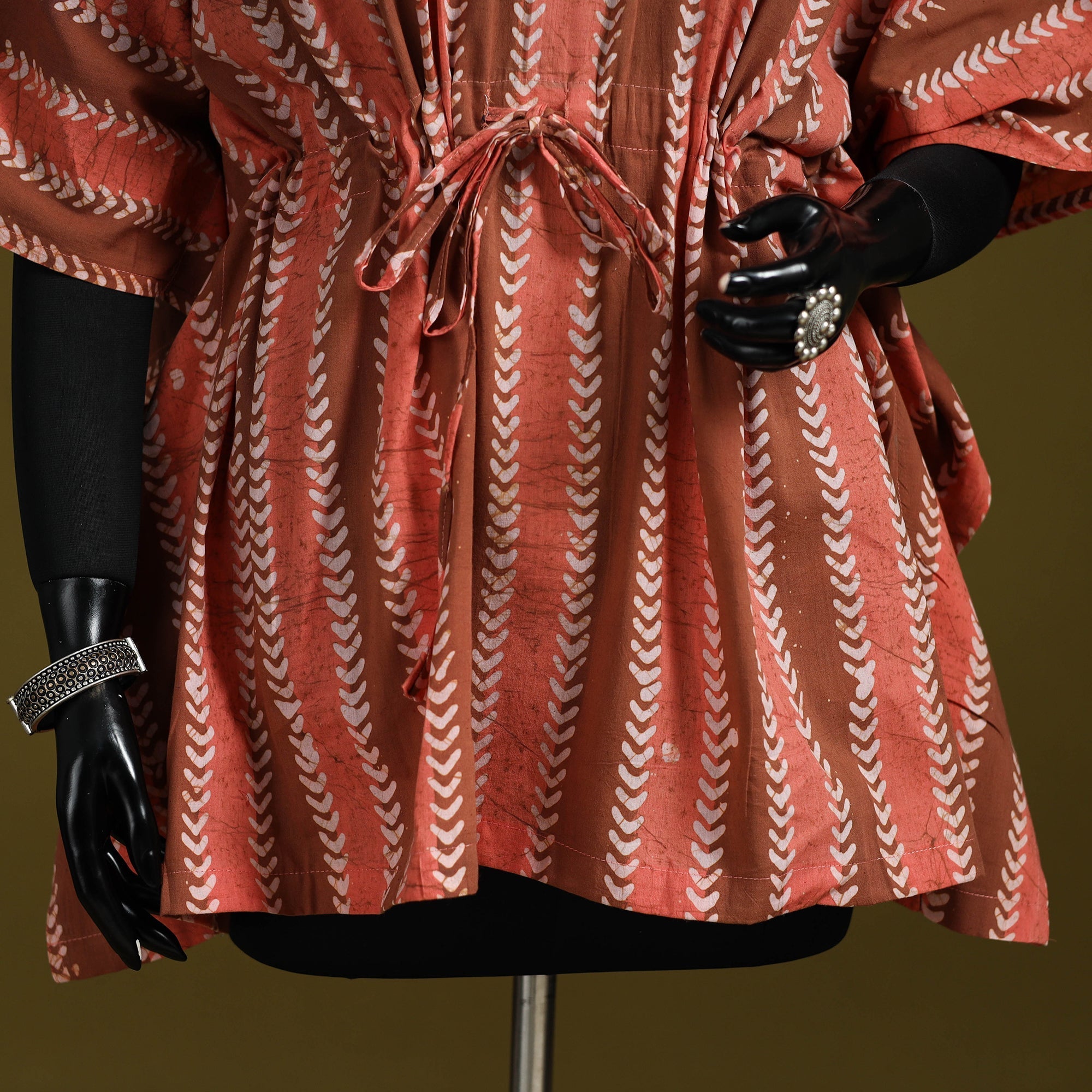 Peach hand block batik print short kaftan created using the traditional wax resist dyeing technique known for bold patterns and crackle effect. Made from breathable cotton it features a drawstring waist for an adjustable fit. Perfect for lounging at home or stepping out for casual outings.
