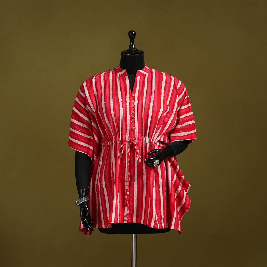Hand block batik print short kaftan created using the traditional wax resist dyeing technique known for bold patterns and crackle effect. Made from breathable cotton it features a drawstring waist for an adjustable fit. Perfect for lounging at home or stepping out for casual outings.