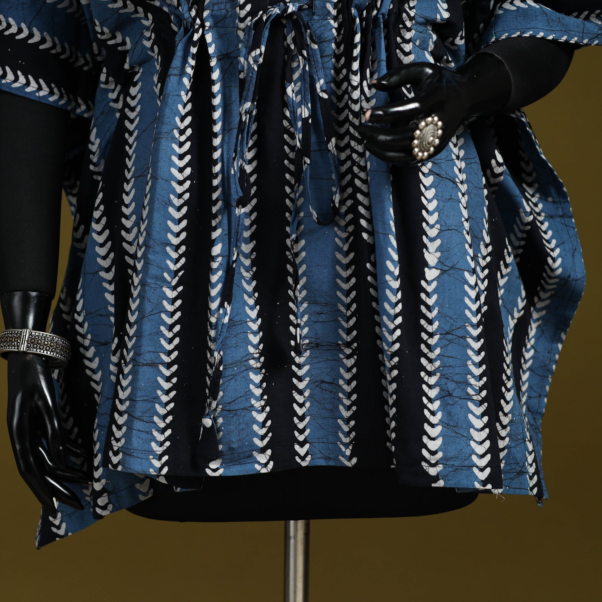 Blue hand block batik print short kaftan created using the traditional wax resist dyeing technique known for bold patterns and crackle effect. Made from breathable cotton it features a drawstring waist for an adjustable fit. Perfect for lounging at home or stepping out for casual outings.