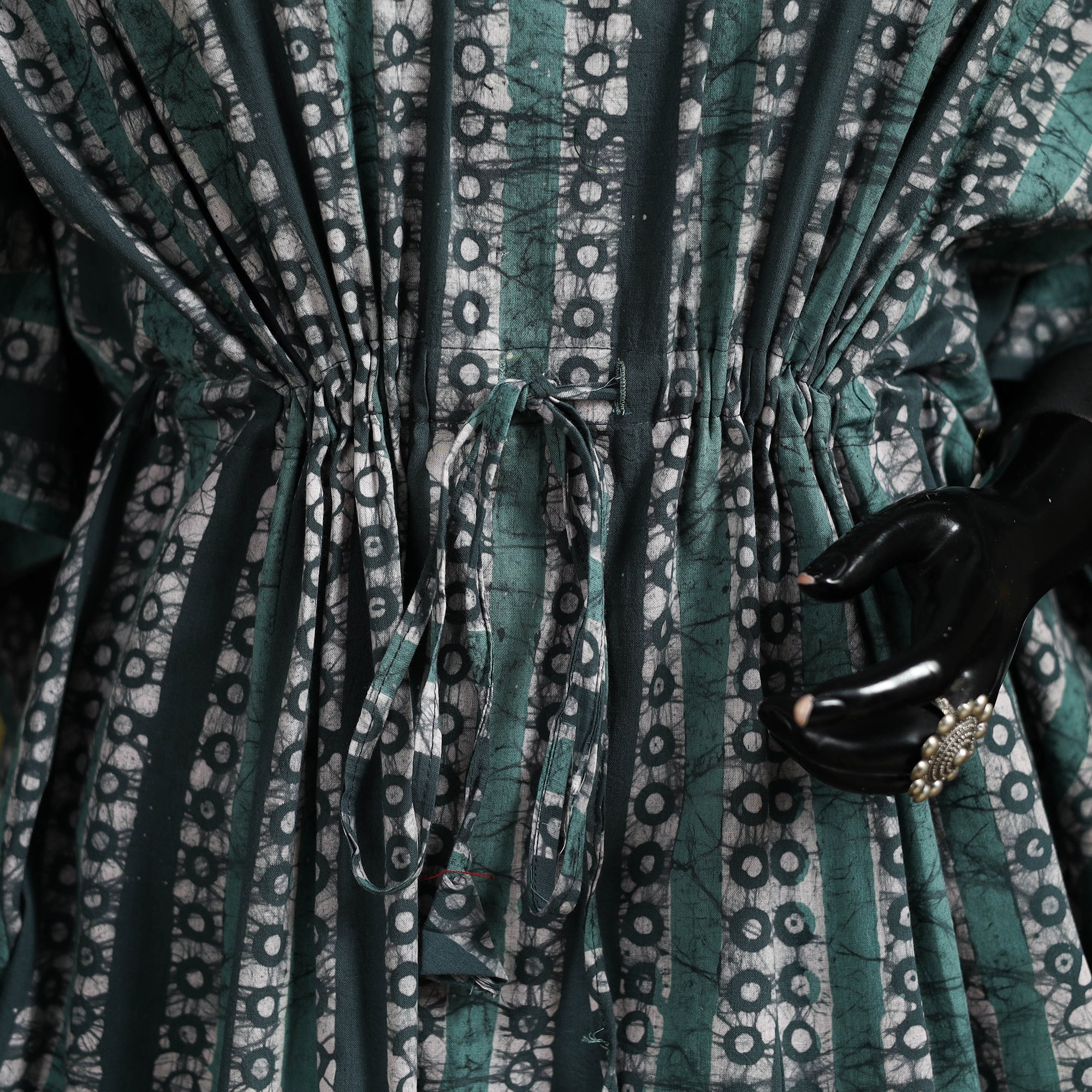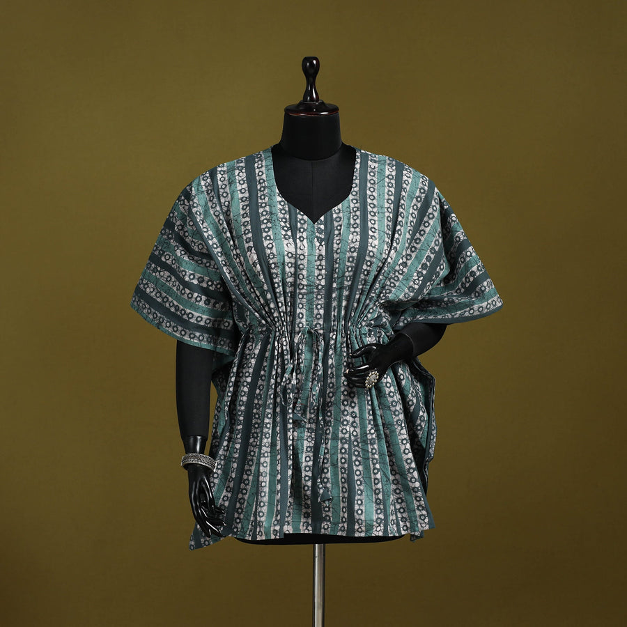 Green hand block batik print short kaftan created using the traditional wax resist dyeing technique known for bold patterns and crackle effect. Made from breathable cotton it features a drawstring waist for an adjustable fit. Perfect for lounging at home or stepping out for casual outings.