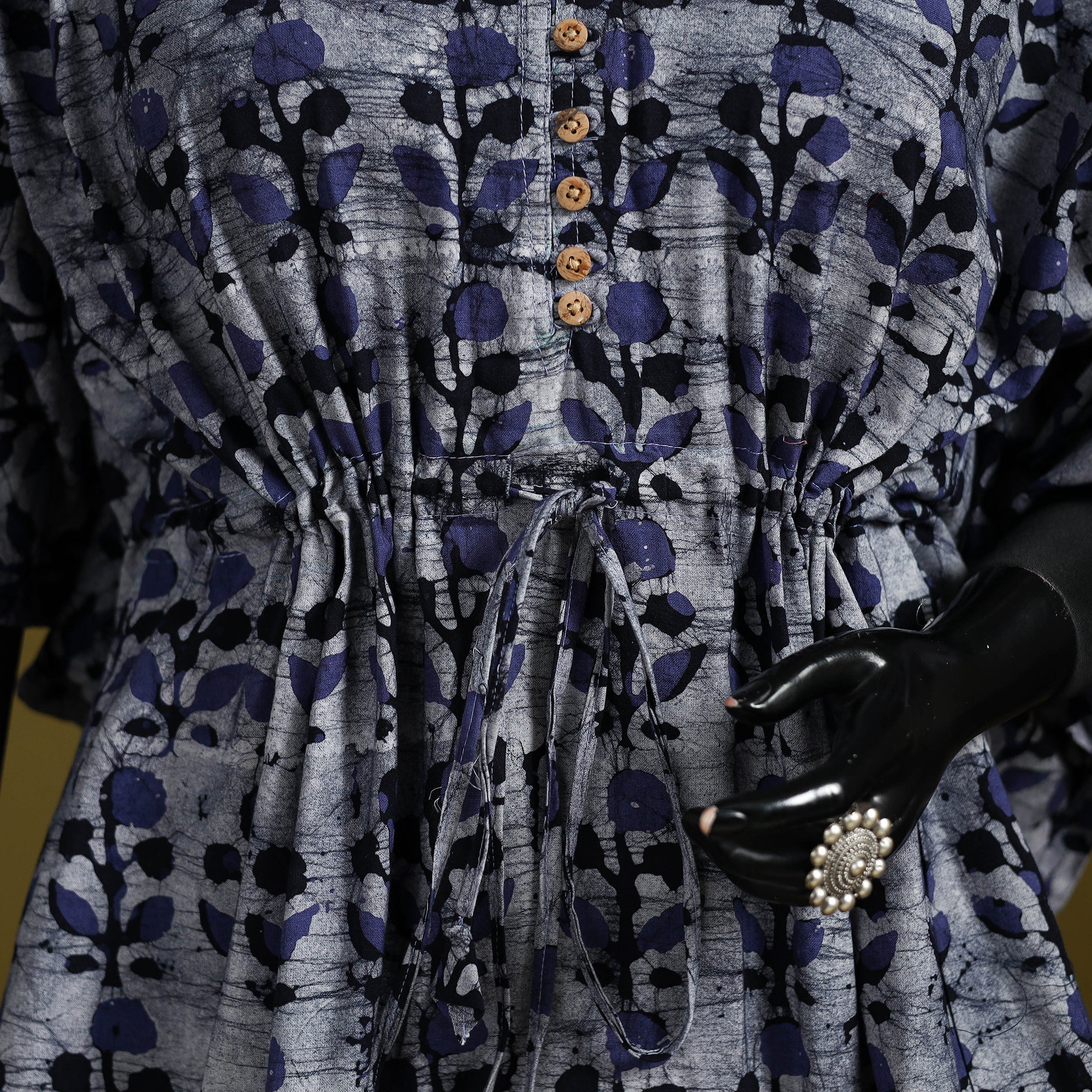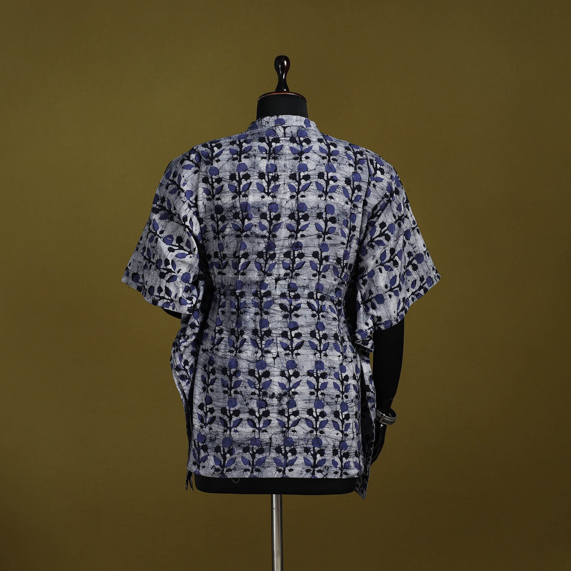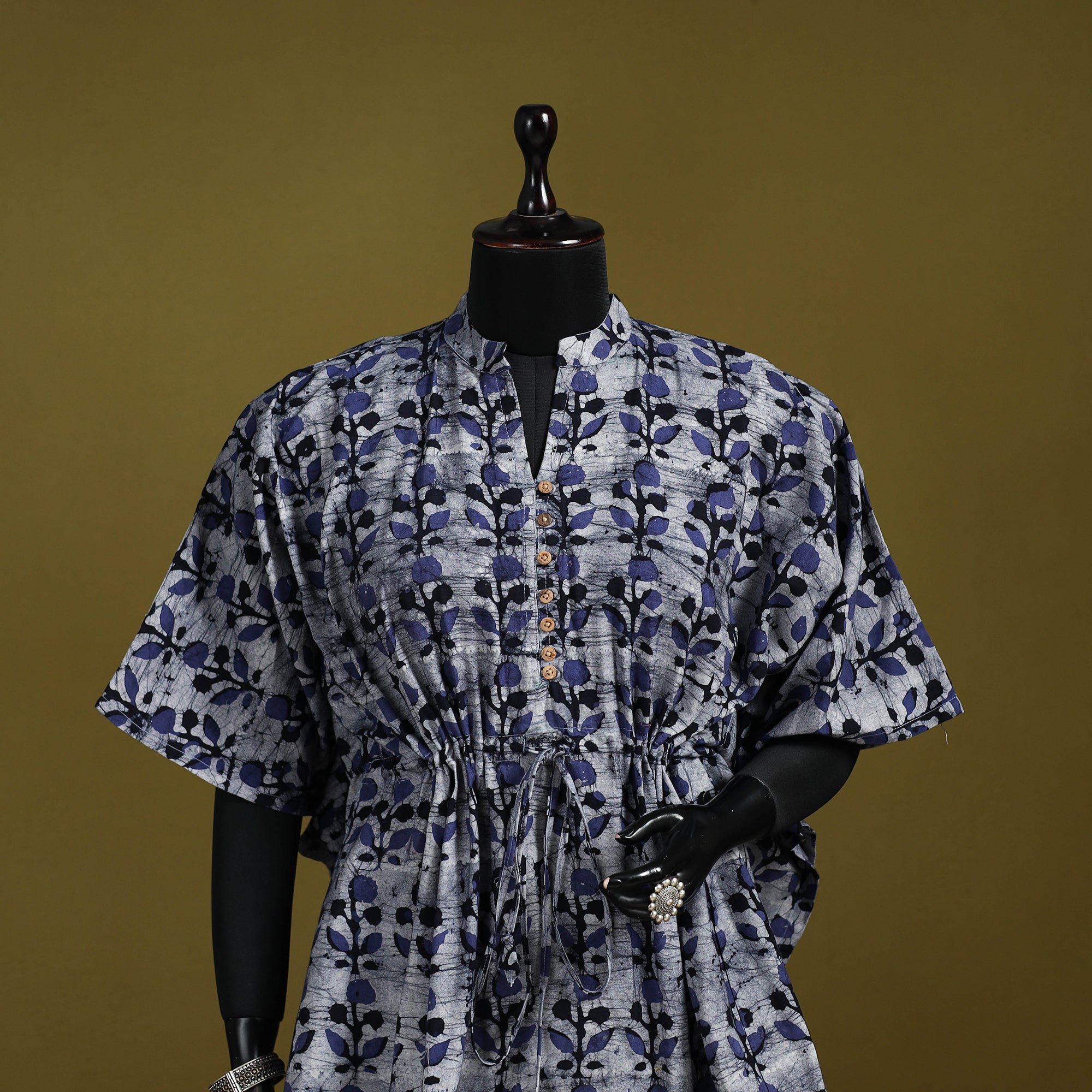 Blue hand block batik print short kaftan created using the traditional wax resist dyeing technique known for bold patterns and crackle effect. Made from breathable cotton it features a drawstring waist for an adjustable fit. Perfect for lounging at home or stepping out for casual outings.