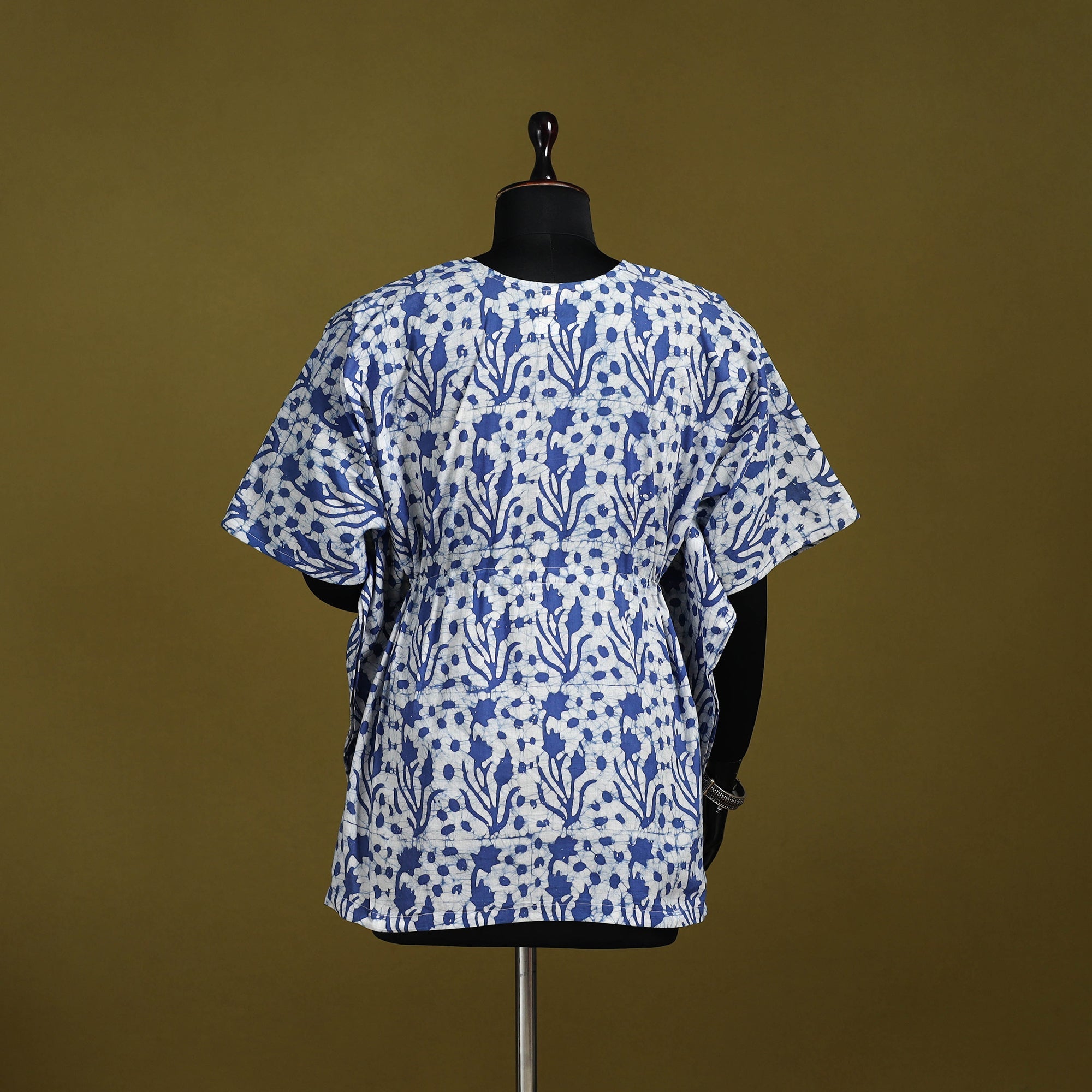 Blue hand block batik print short kaftan created using the traditional wax resist dyeing technique known for bold patterns and crackle effect. Made from breathable cotton it features a drawstring waist for an adjustable fit. Perfect for lounging at home or stepping out for casual outings.