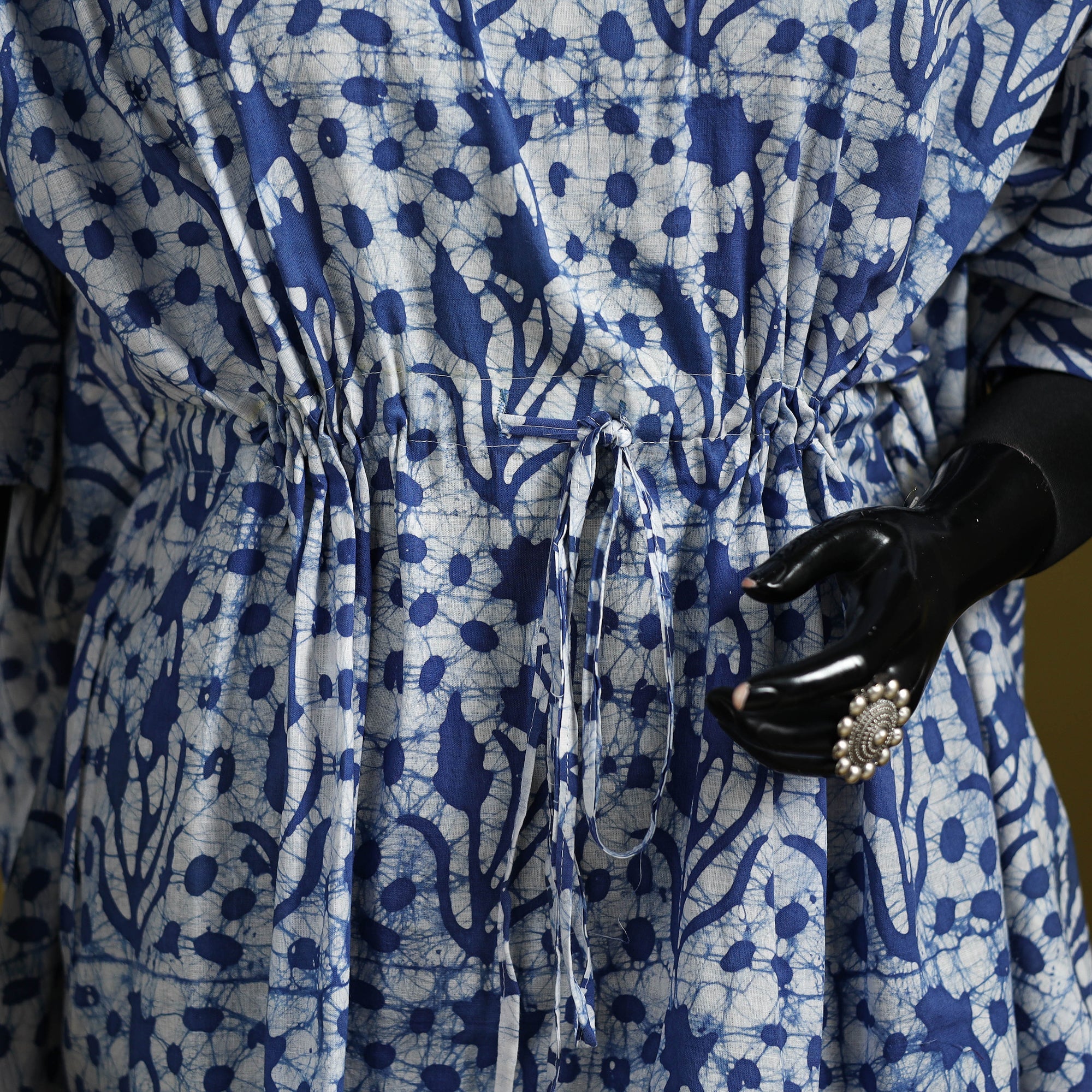 Hand block batik print short kaftan created using the traditional wax resist dyeing technique known for bold patterns and crackle effect. Made from breathable cotton it features a drawstring waist for an adjustable fit. Perfect for lounging at home or stepping out for casual outings.