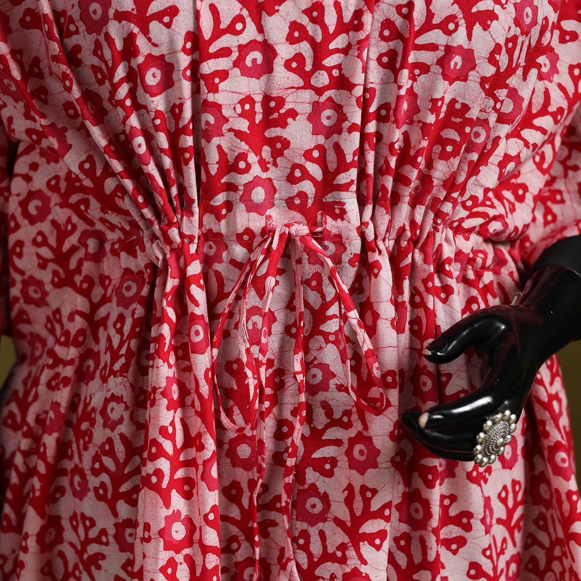 Red hand block batik print short kaftan created using the traditional wax resist dyeing technique known for bold patterns and crackle effect. Made from breathable cotton it features a drawstring waist for an adjustable fit. Perfect for lounging at home or stepping out for casual outings.