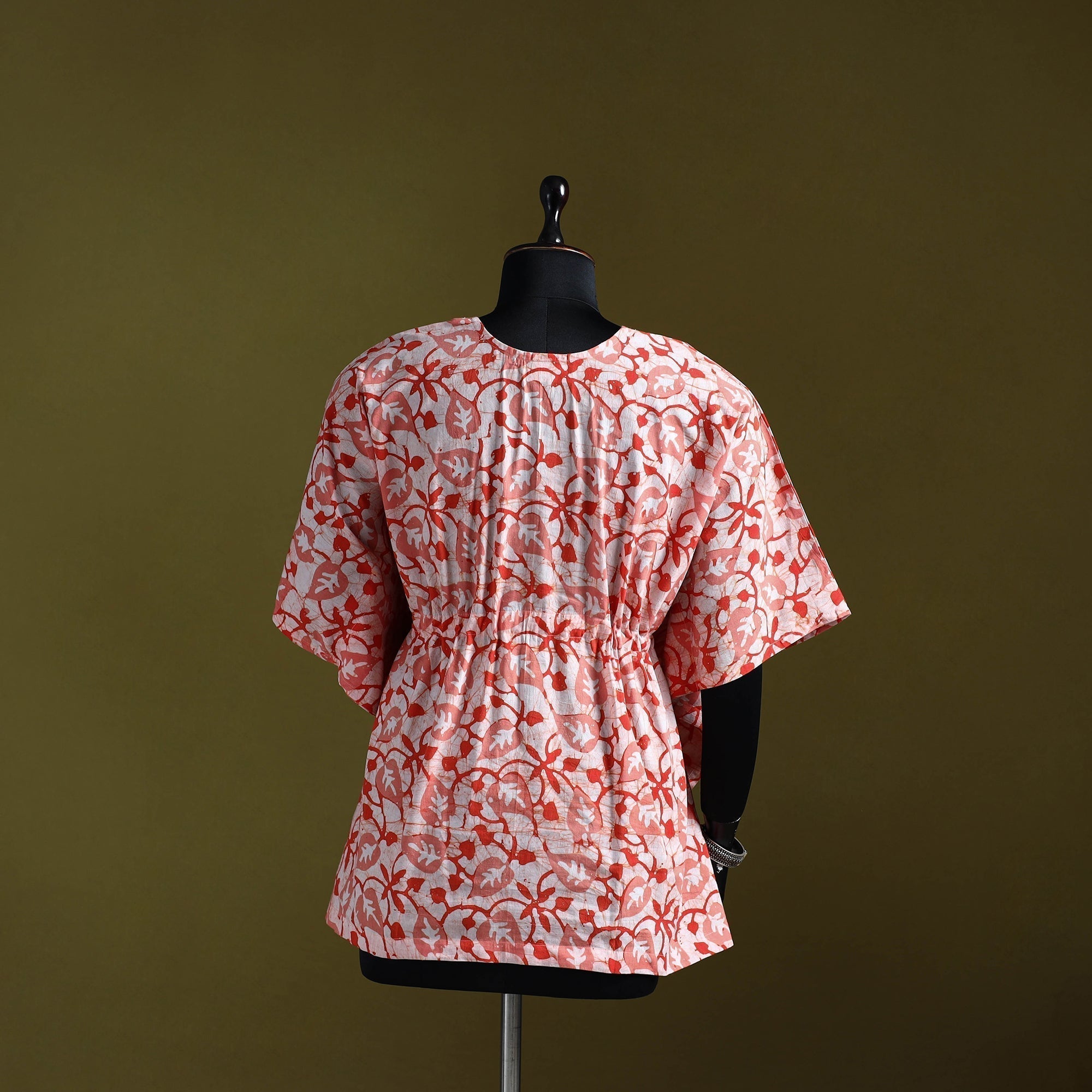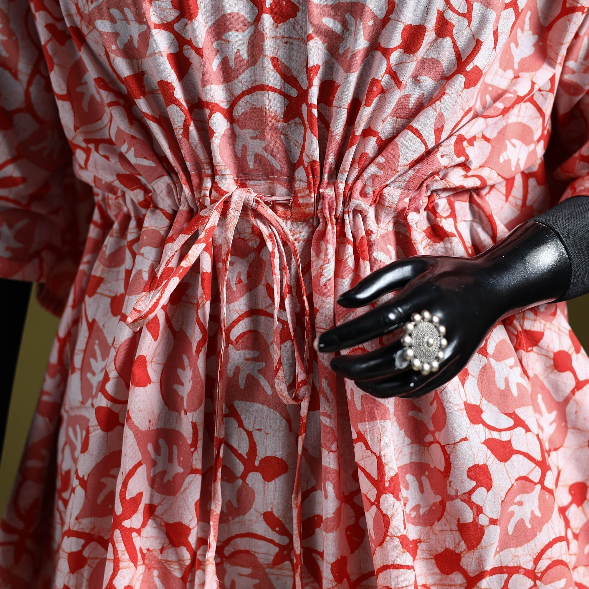 | Material | Pink hand block batik print short kaftan created using the traditional wax resist dyeing technique, estimated to be around 2,000 years old and known for its bold patterns and crackle effect. Made from breathable cotton, it features a drawstring waist for an adjustable fit. Perfect for lounging at home or casual outings. |
