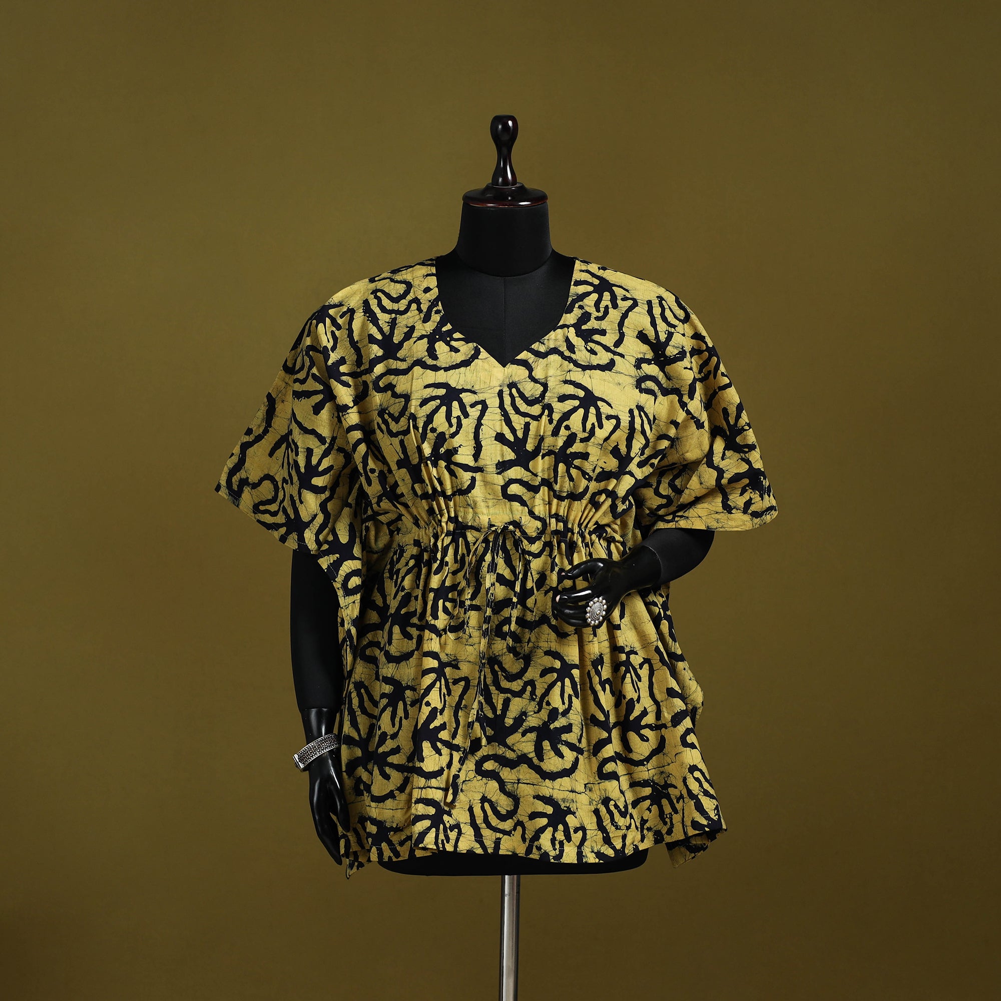 Yellow hand block batik print short kaftan created using the traditional wax resist dyeing technique known for bold patterns and crackle effect. Made from breathable cotton it features a drawstring waist for an adjustable fit. Perfect for lounging at home or stepping out for casual outings.