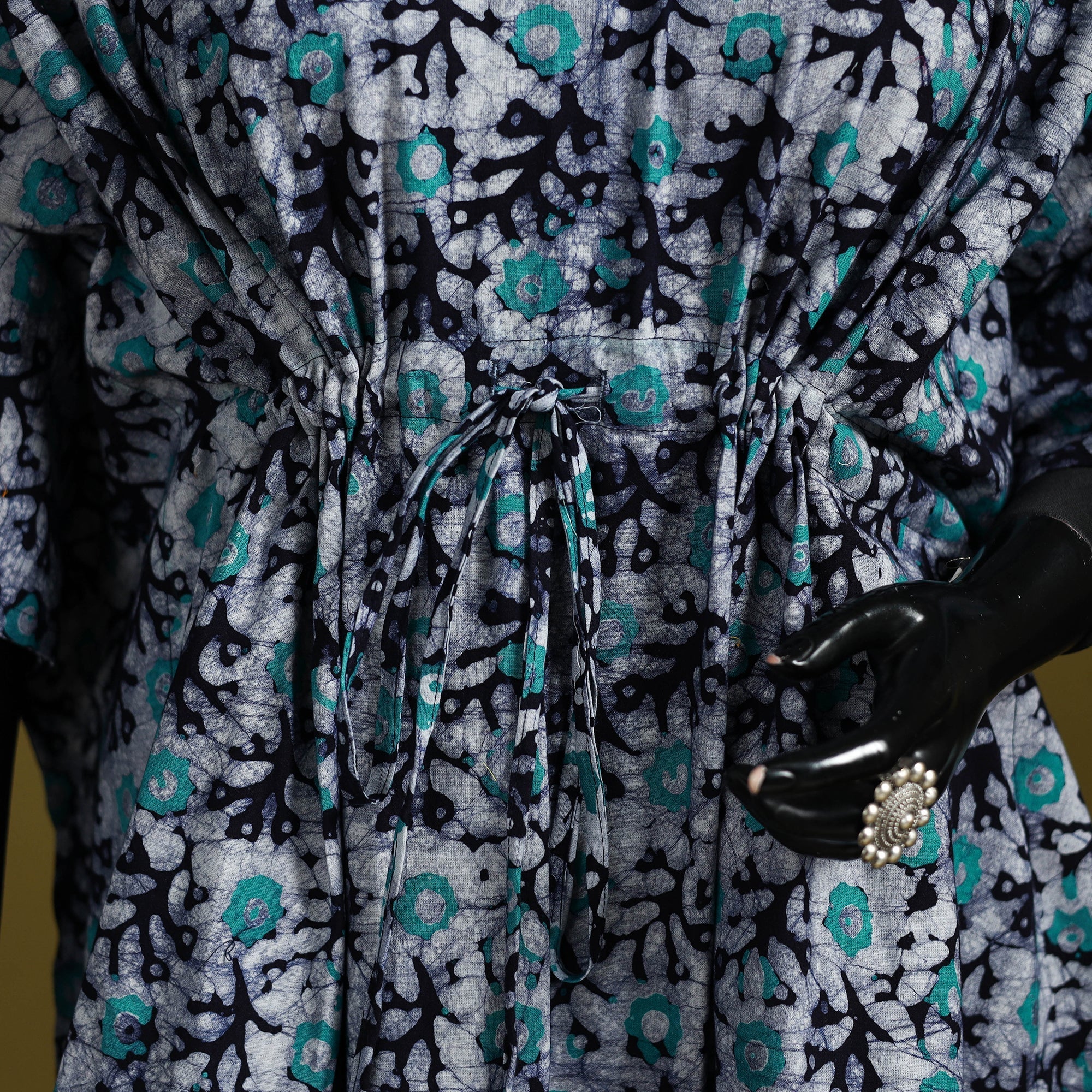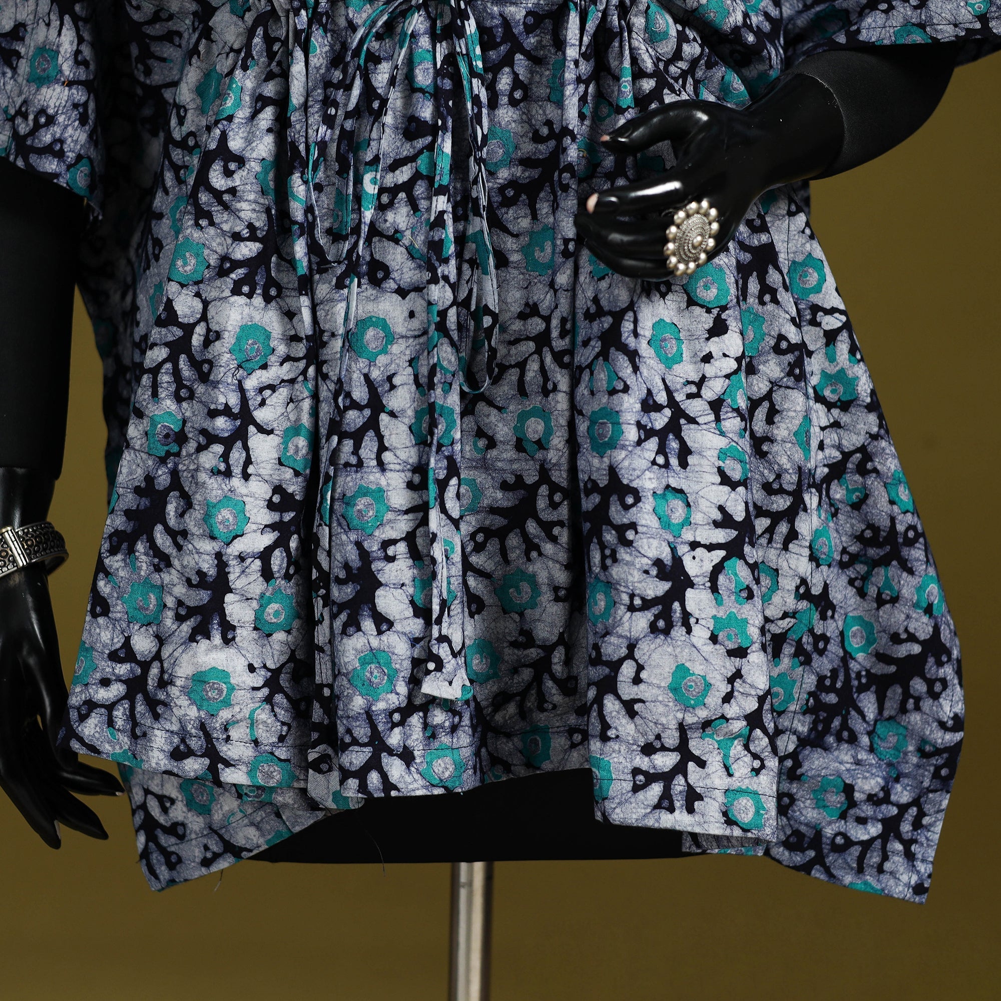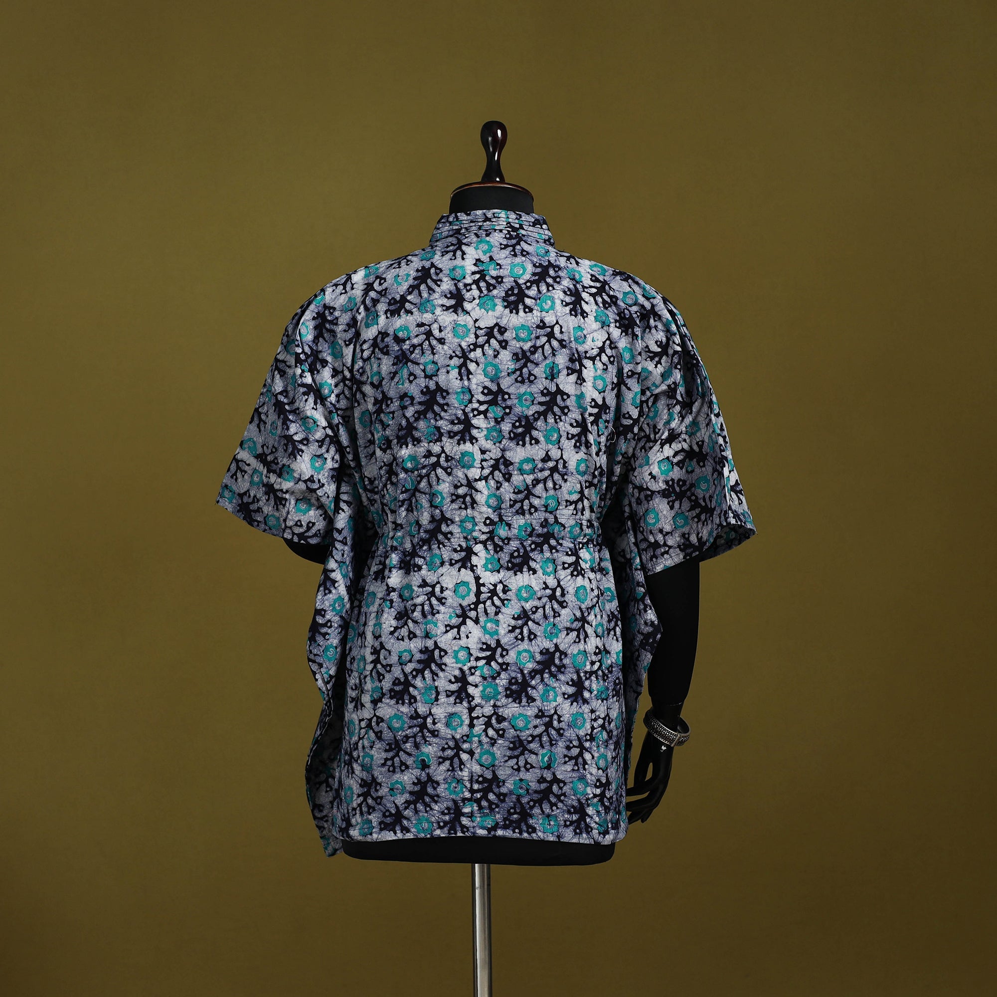 Blue hand block batik print short kaftan created using the traditional wax resist dyeing technique known for bold patterns and crackle effect. Made from breathable cotton it features a drawstring waist for an adjustable fit. Perfect for lounging at home or stepping out for casual outings.