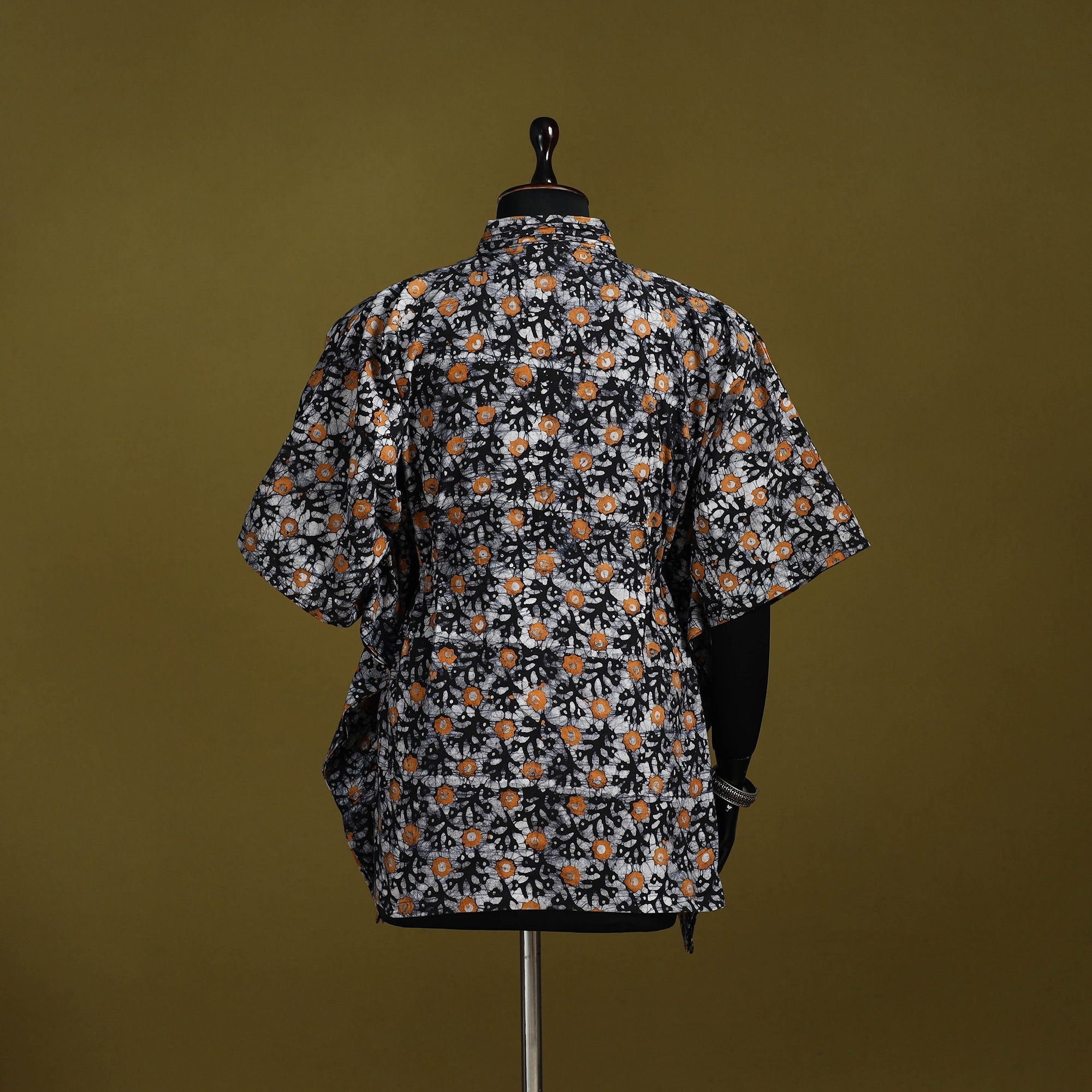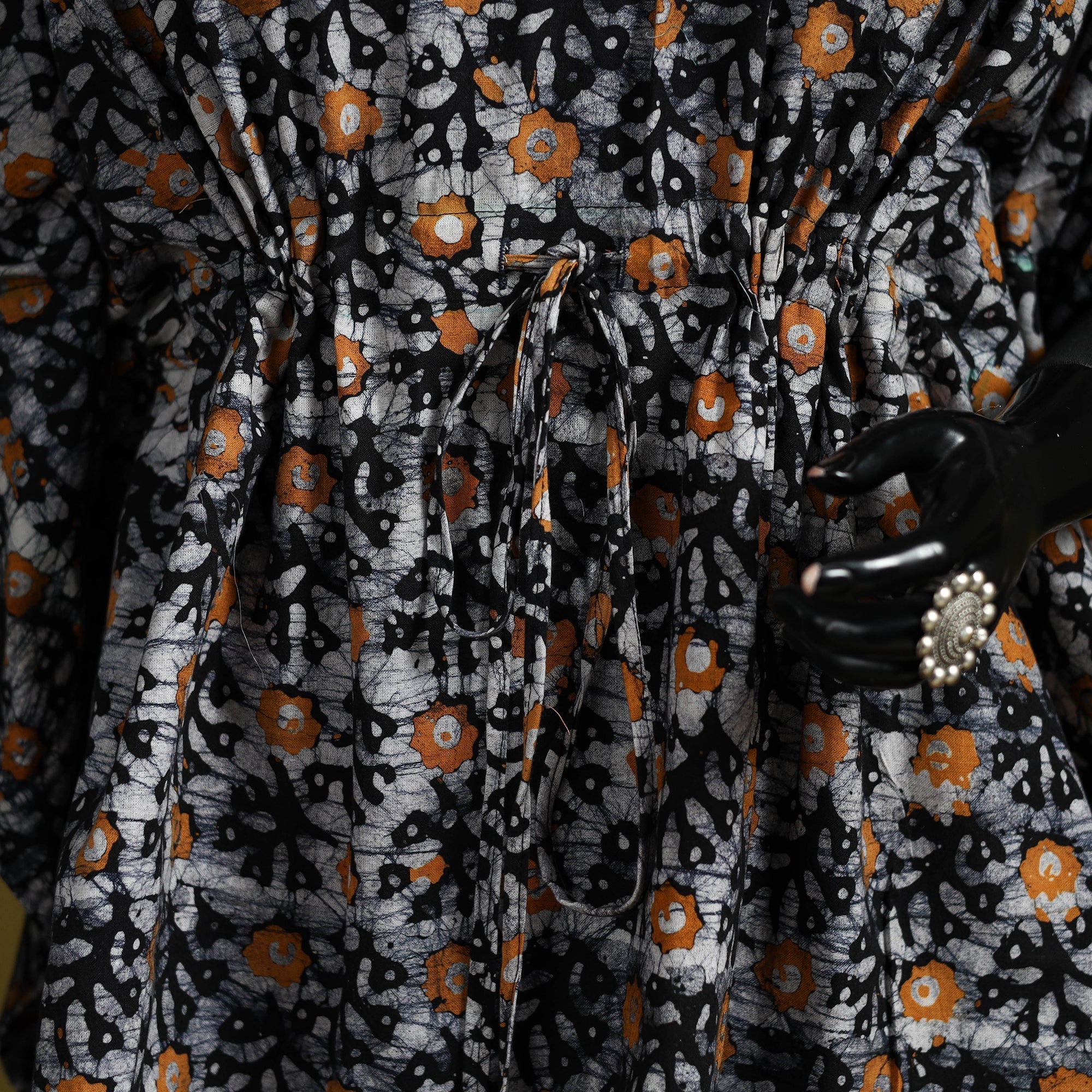 Black hand block batik print short kaftan created using the traditional wax resist dyeing technique known for bold patterns and crackle effect. Made from breathable cotton it features a drawstring waist for an adjustable fit. Perfect for lounging at home or stepping out for casual outings.