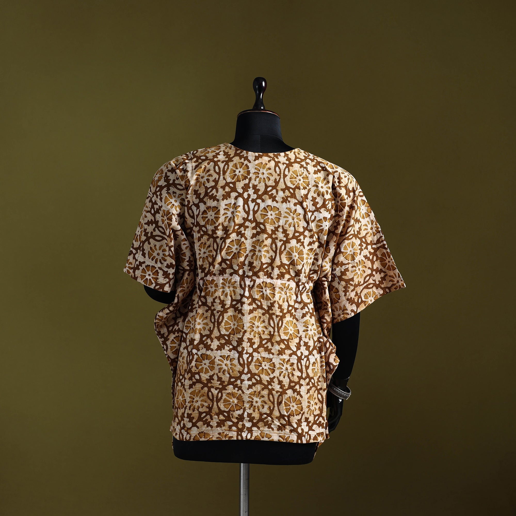 | Material | Brown hand block batik print short kaftan created using the traditional wax resist dyeing technique, estimated to be around 2,000 years old and known for its bold patterns and crackle effect. Made from breathable cotton, it features a drawstring waist for an adjustable fit. Perfect for lounging at home or casual outings. |
