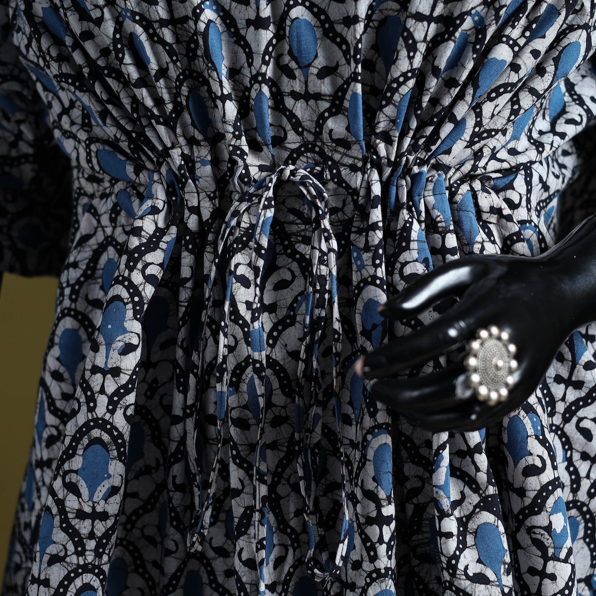 Blue hand block batik print short kaftan created using the traditional wax resist dyeing technique, estimated to be around 2,000 years old and known for its bold patterns and crackle effect. Made from breathable cotton, it features a drawstring waist for an adjustable fit. Perfect for lounging at home or casual outings.