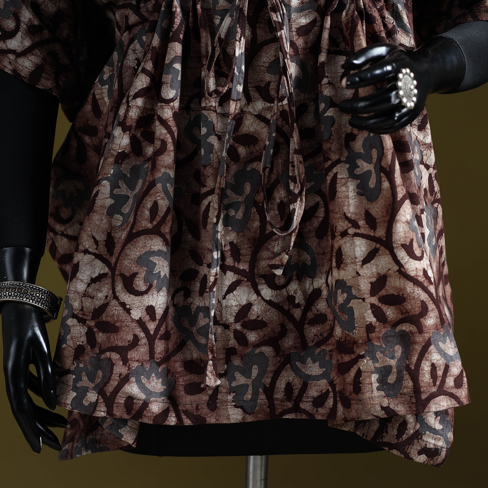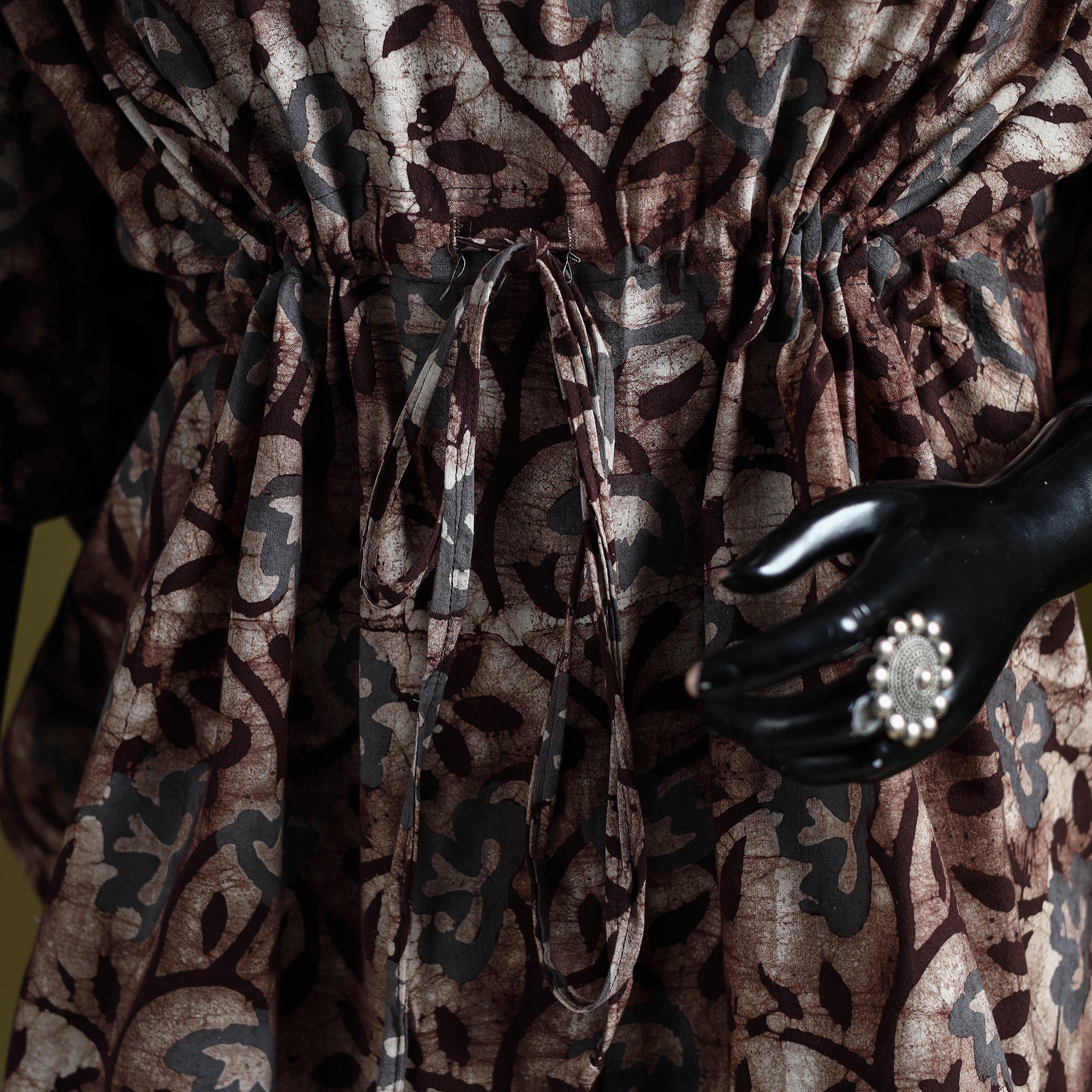 | Material | Brown hand block batik print short kaftan created using the traditional wax resist dyeing technique, estimated to be around 2,000 years old and known for its bold patterns and crackle effect. Made from breathable cotton, it features a drawstring waist for an adjustable fit. Perfect for lounging at home or casual outings. |