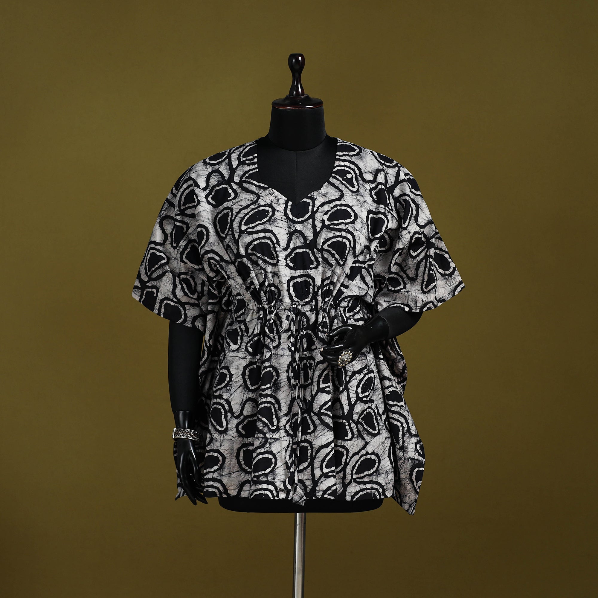 Hand block batik print short kaftan created using the traditional wax resist dyeing technique known for bold patterns and crackle effect. Made from breathable cotton it features a drawstring waist for an adjustable fit. Perfect for lounging at home or stepping out for casual outings.
