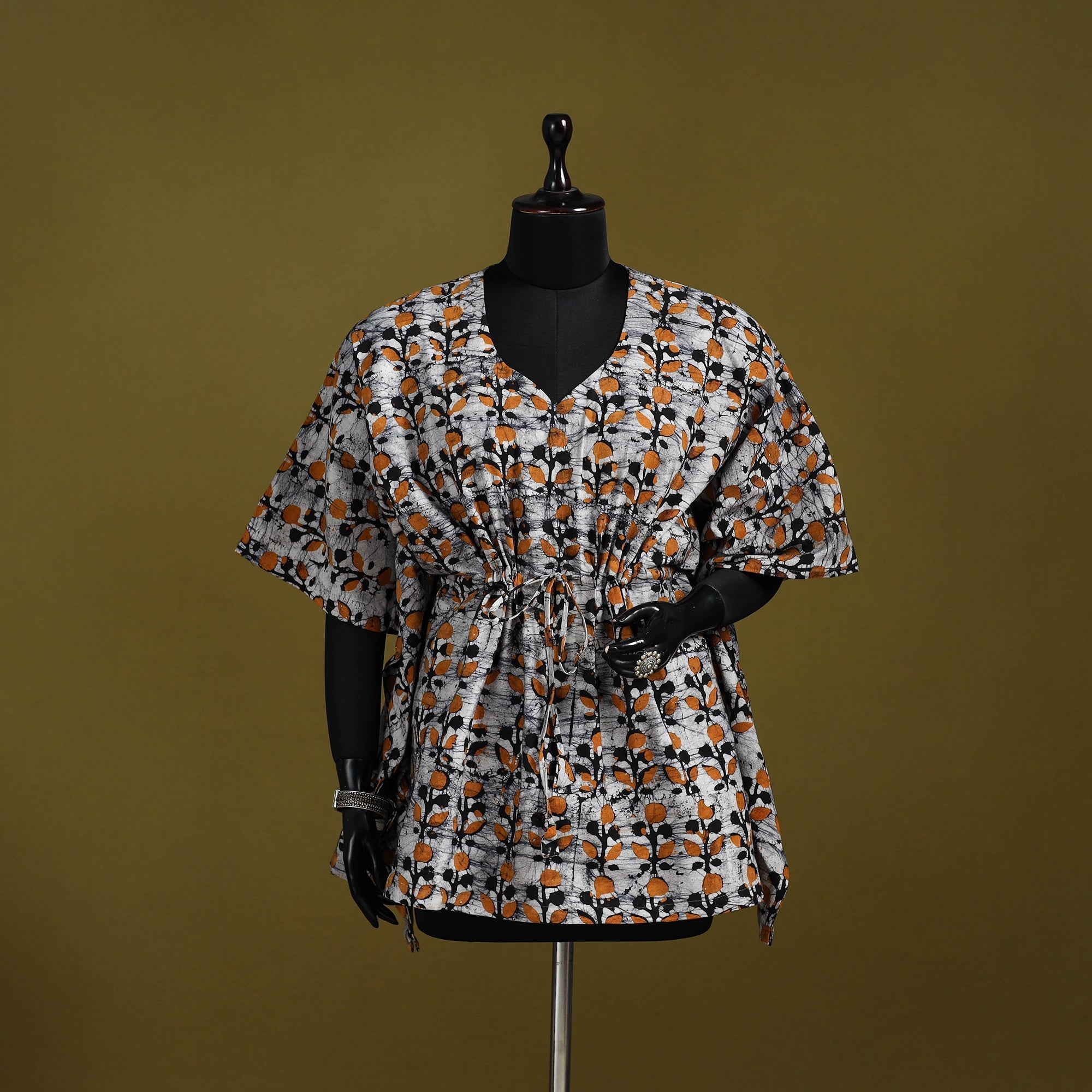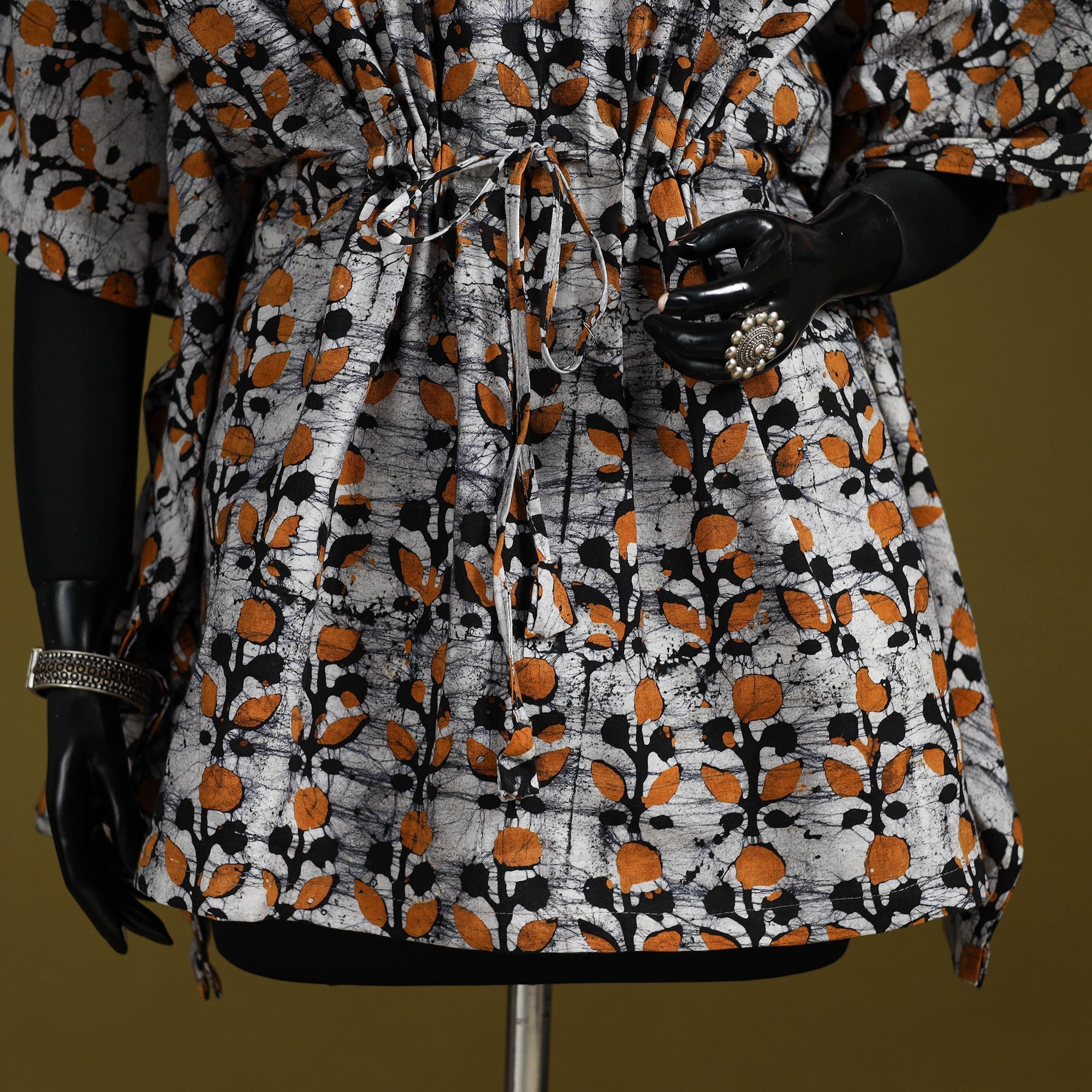 Black hand block batik print short kaftan created using the traditional wax resist dyeing technique known for bold patterns and crackle effect. Made from breathable cotton it features a drawstring waist for an adjustable fit. Perfect for lounging at home or stepping out for casual outings.