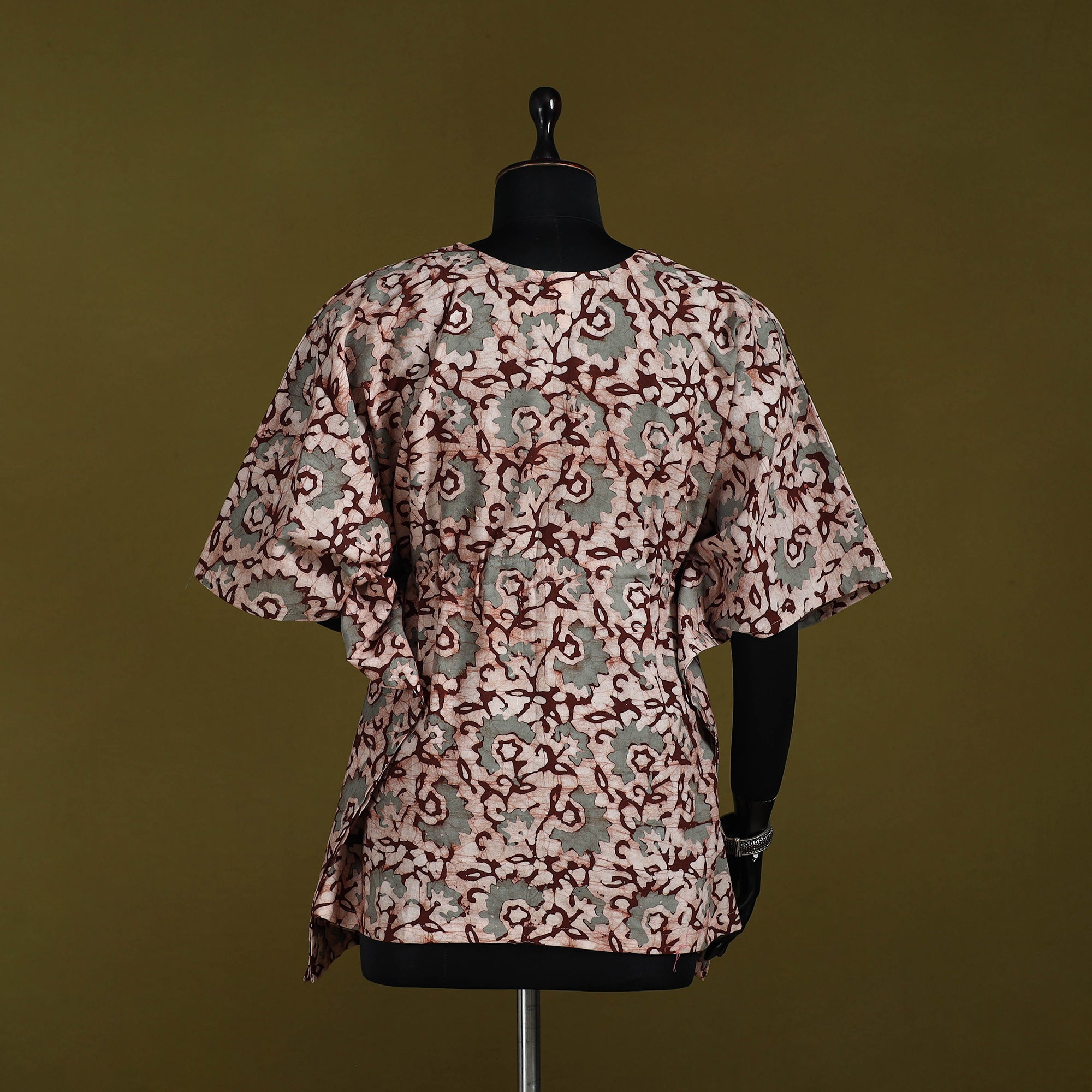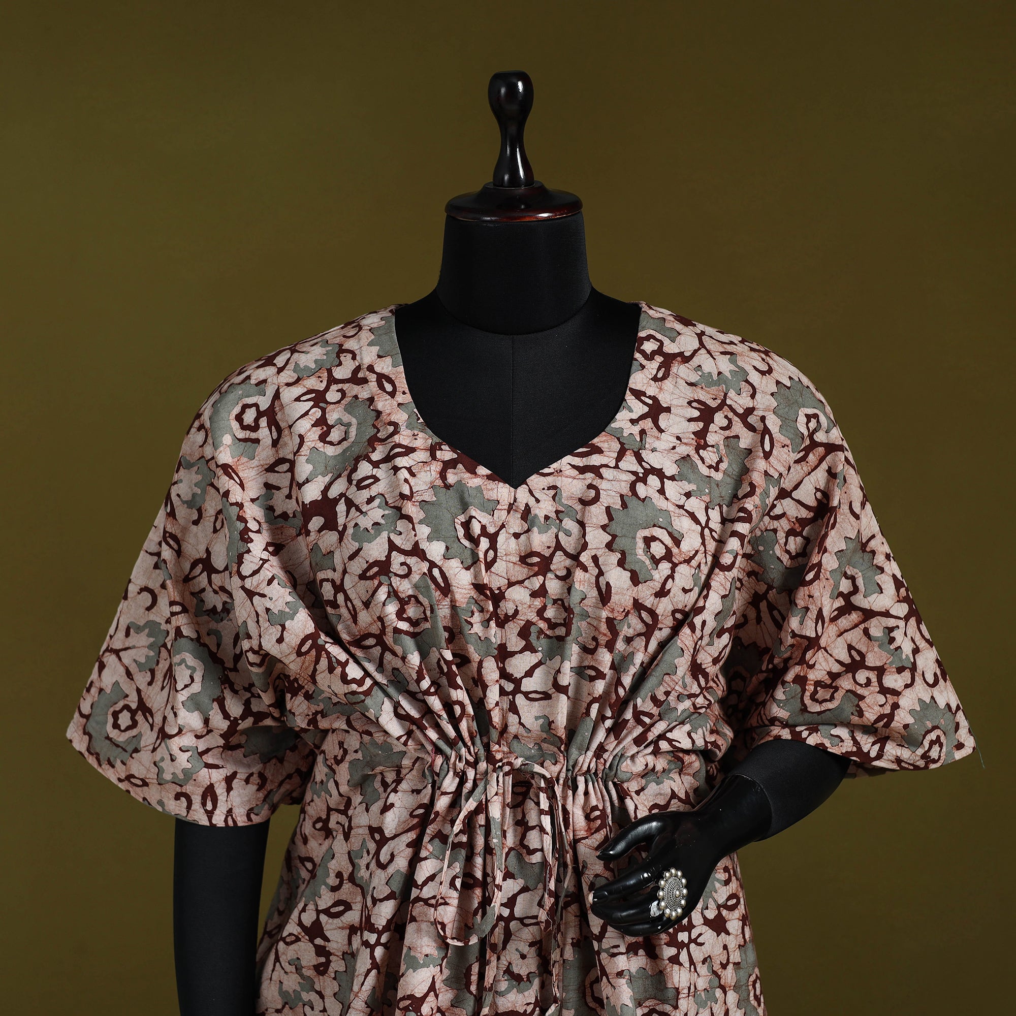 | Material | Brown hand block batik print pcotton short kaftan created using the traditional wax-resist dyeing technique, a craft believed to be over 2,000 years old and known for its bold patterns and signature crackle effect. Made from breathable cotton, this kaftan features flowing sleeves and a drawstring waist tie that lets you adjust the fit to suit your shape. Perfect for relaxed lounging at home or easygoing casual outings. |