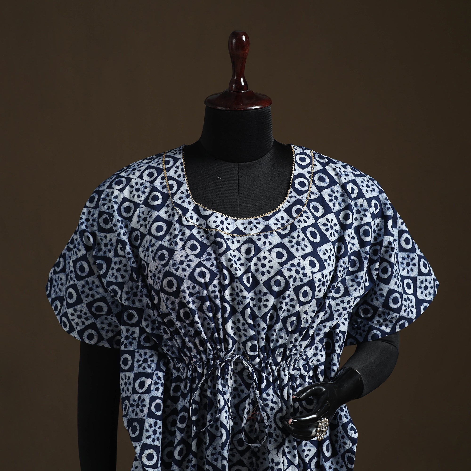 | Material | This blue hand block batik print short kaftan with gota work is created using a traditional wax-resist dyeing technique practiced in India for centuries. Made from cotton, the kaftan features flowing sleeves and a drawstring waist tie that allows you to adjust the fit comfortably. Perfect for relaxed lounging at home or easygoing casual outings. |