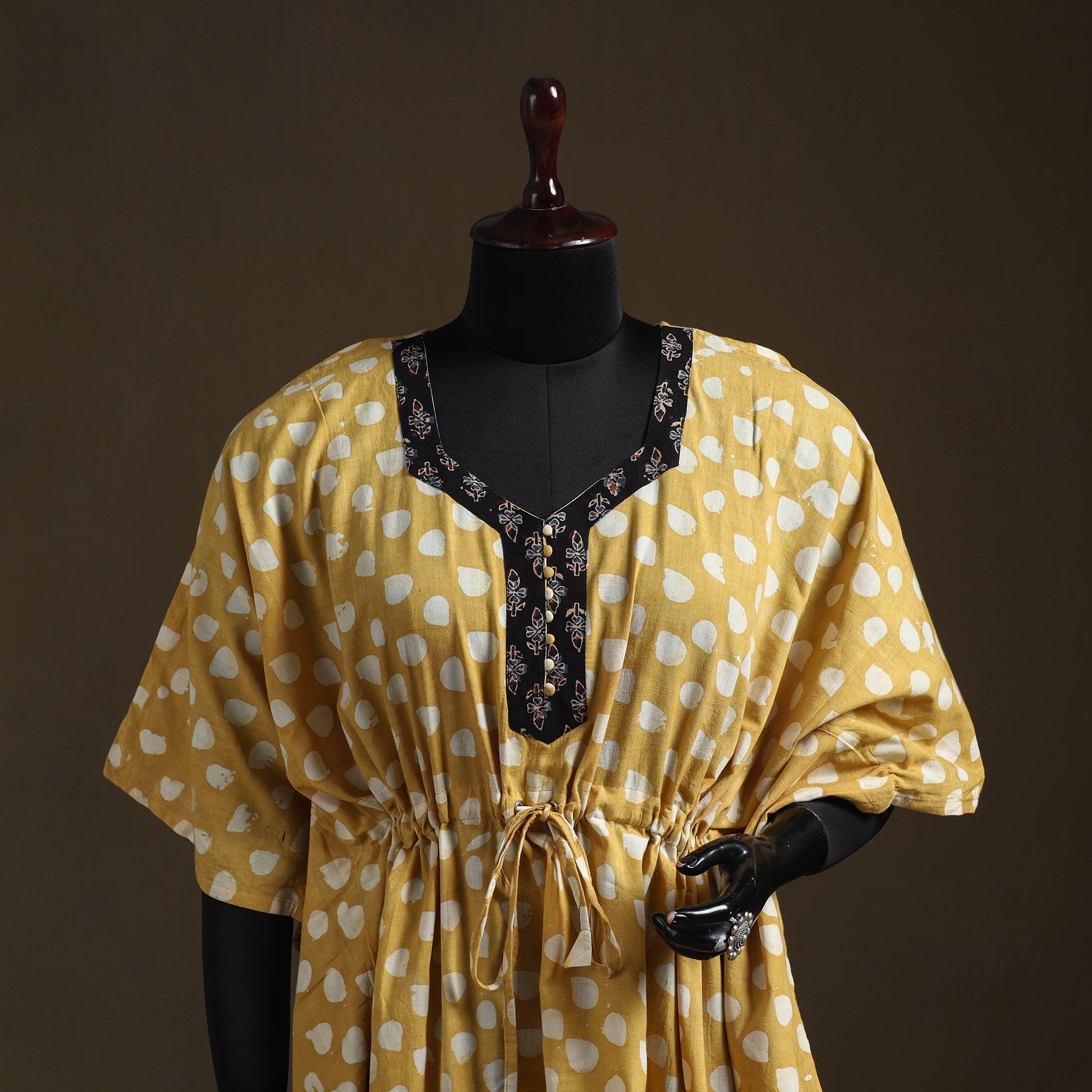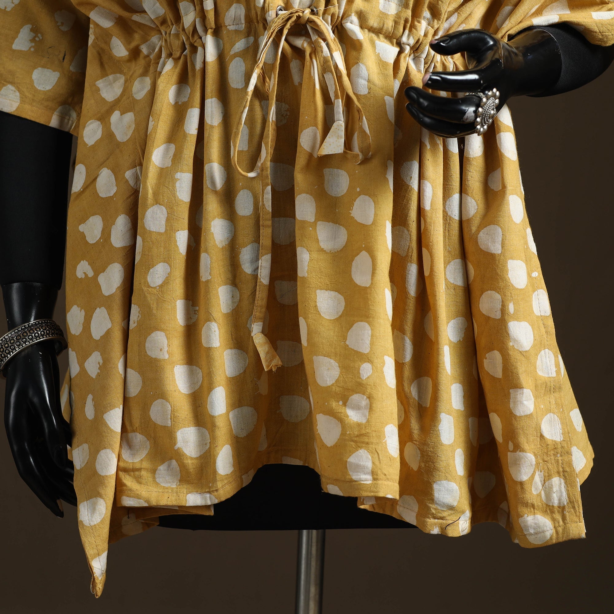 | Material | Yellow hand block batik patchwork defines this short kaftan, produced using a wax-resist dyeing practice rooted in long-standing textile traditions. The process forms patterns during dyeing rather than printing. Crafted in cotton, it includes flowing sleeves and an adjustable waist tie. Well suited for easy home wear or laid-back occasions. |