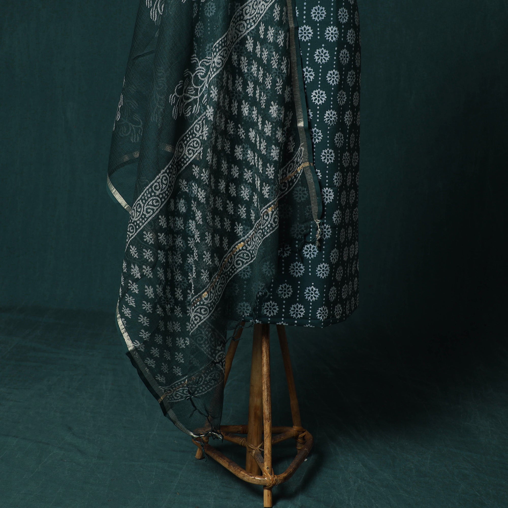 Hand block jaipur print cotton 3pc unstitched dress material blends traditional artistry with everyday comfort. It is created using the traditional hand block printing technique of Jaipur, Rajasthan. This age-old method is practised by skilled artisans who use hand-carved wooden blocks to produce fine, detailed patterns on the fabric. The kurta and bottom fabrics are made from cotton. The dupatta is crafted in kota doria cotton. Kota Doria is an age-old Indian textile produced in the Kota district of Rajasthan. The doria, or threads, are finely interwoven to create signature check patterns. Its lightweight and sheer texture give it an exquisite grace and elegance of its own. This set suitable for daily wear, workdays and gatherings.