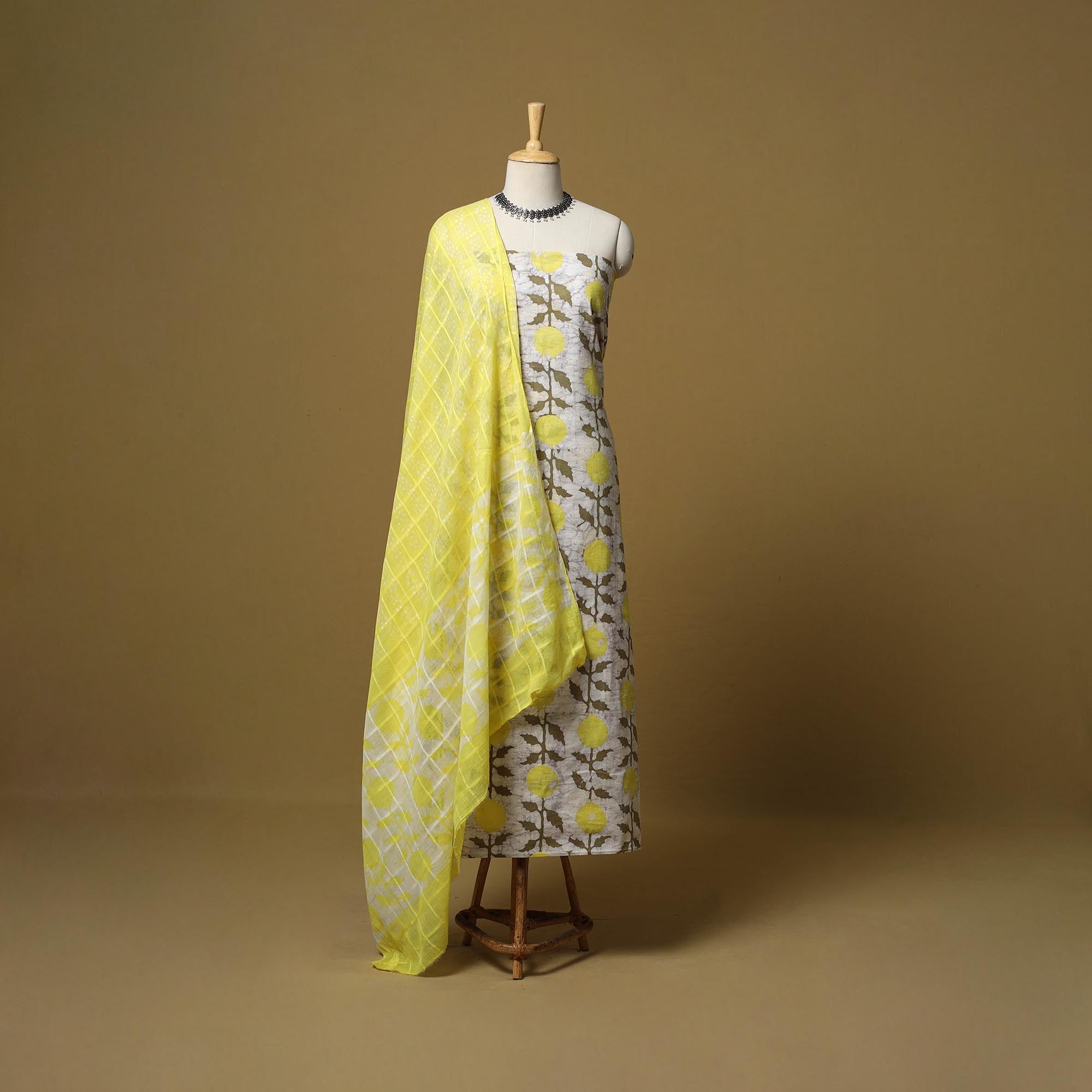Hand block batik print cotton 3pc unstitched dress material made by skilled artisans from Kutch. Crafted using the centuries-old wax-resist dyeing technique this set includes a kurta piece, matching bottom piece and a mul cotton dupatta. The traditional designs and cracking effect in batik are often passed down through generations. This set is suitable for daily wear, casual gatherings or relaxed ethnic styling.