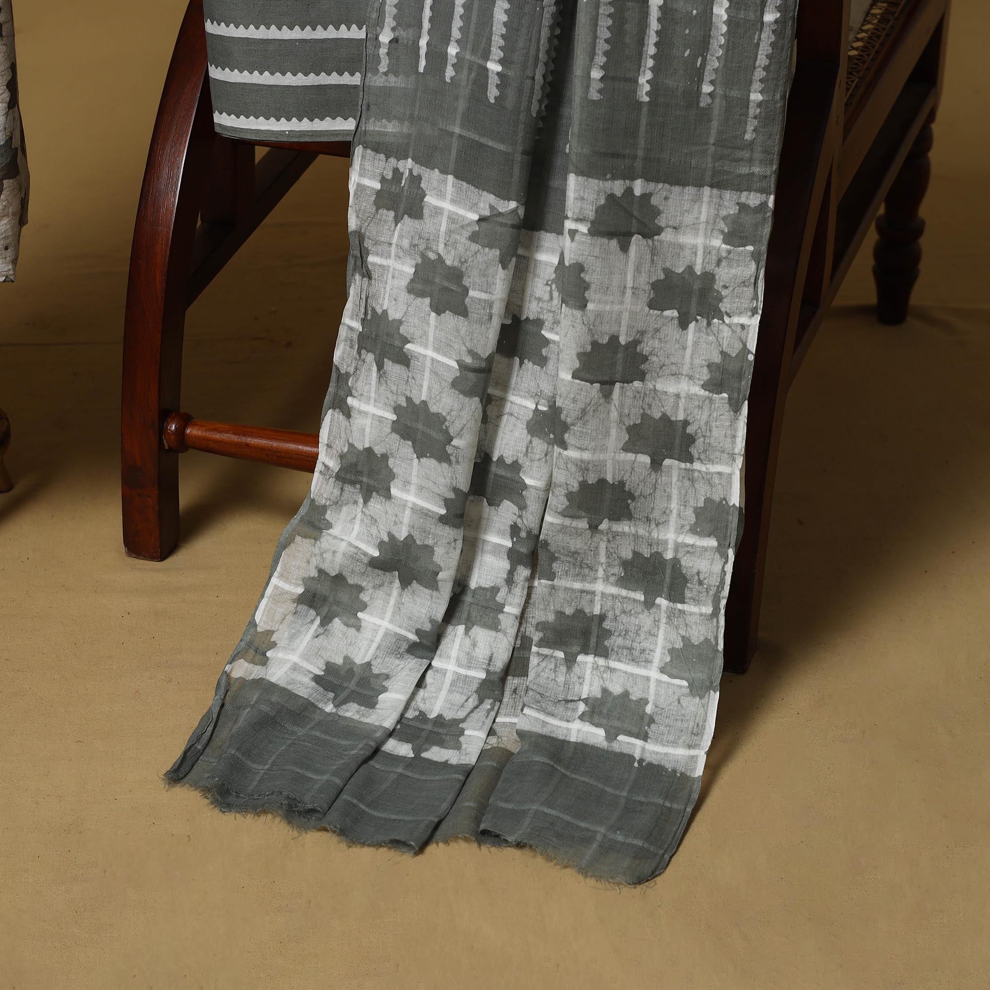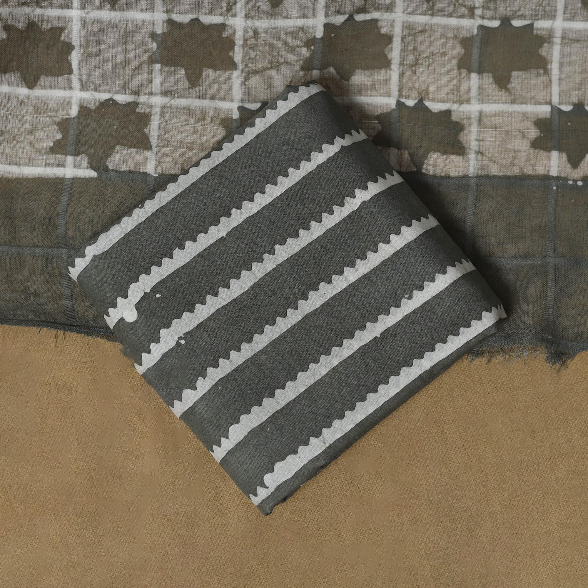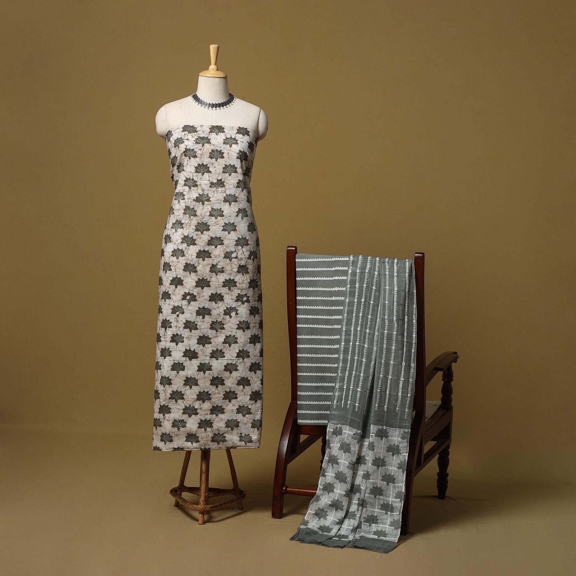 Hand block batik print cotton 3pc unstitched dress material made by skilled artisans from Kutch. Crafted using the centuries-old wax-resist dyeing technique this set includes a kurta piece, matching bottom piece and a mul cotton dupatta. The traditional designs and cracking effect in batik are often passed down through generations. This set is suitable for daily wear, casual gatherings or relaxed ethnic styling.