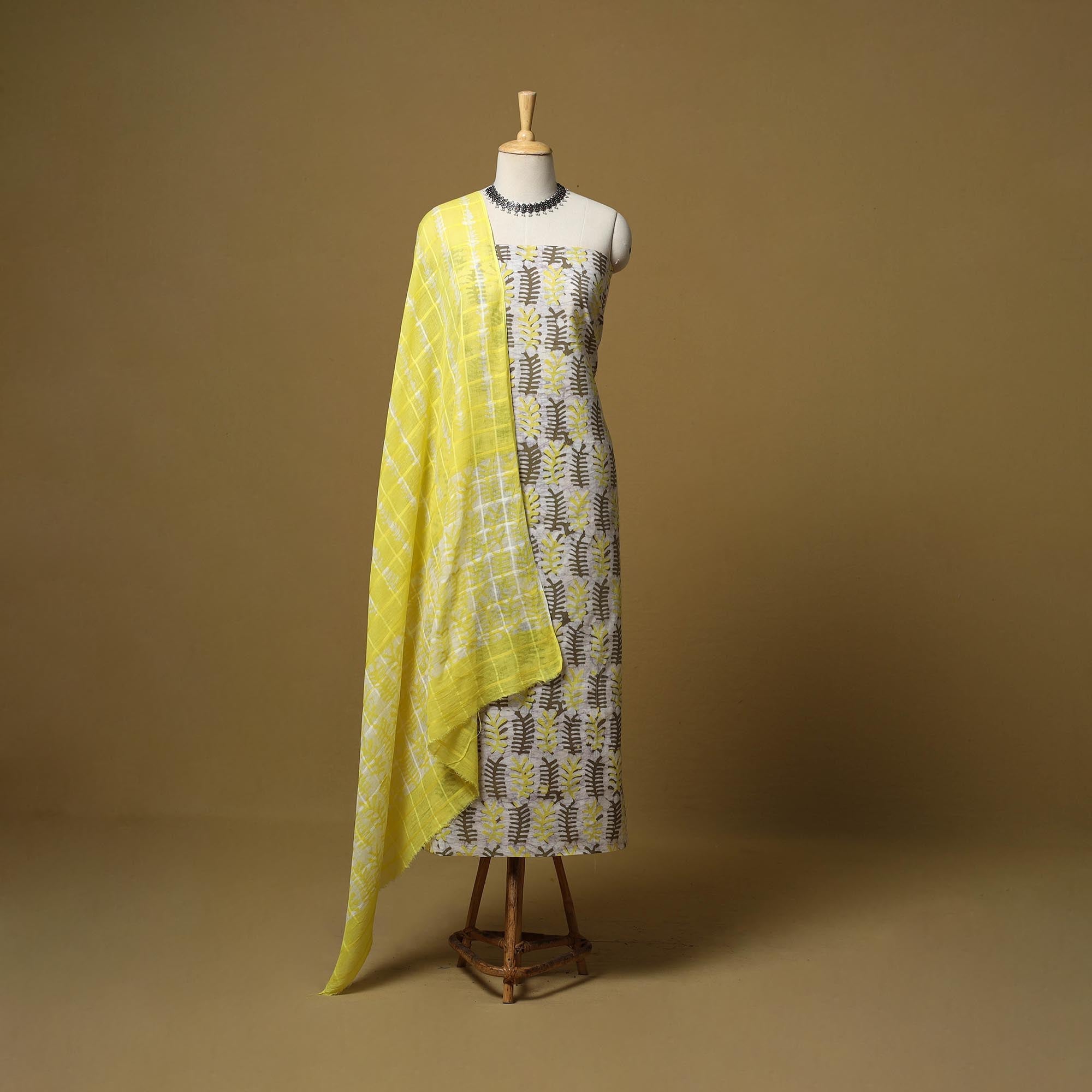Hand block batik print cotton 3pc unstitched dress material made by skilled artisans from Kutch. Crafted using the centuries-old wax-resist dyeing technique this set includes a kurta piece, matching bottom piece and a mul cotton dupatta. The traditional designs and cracking effect in batik are often passed down through generations. This set is suitable for daily wear, casual gatherings or relaxed ethnic styling.