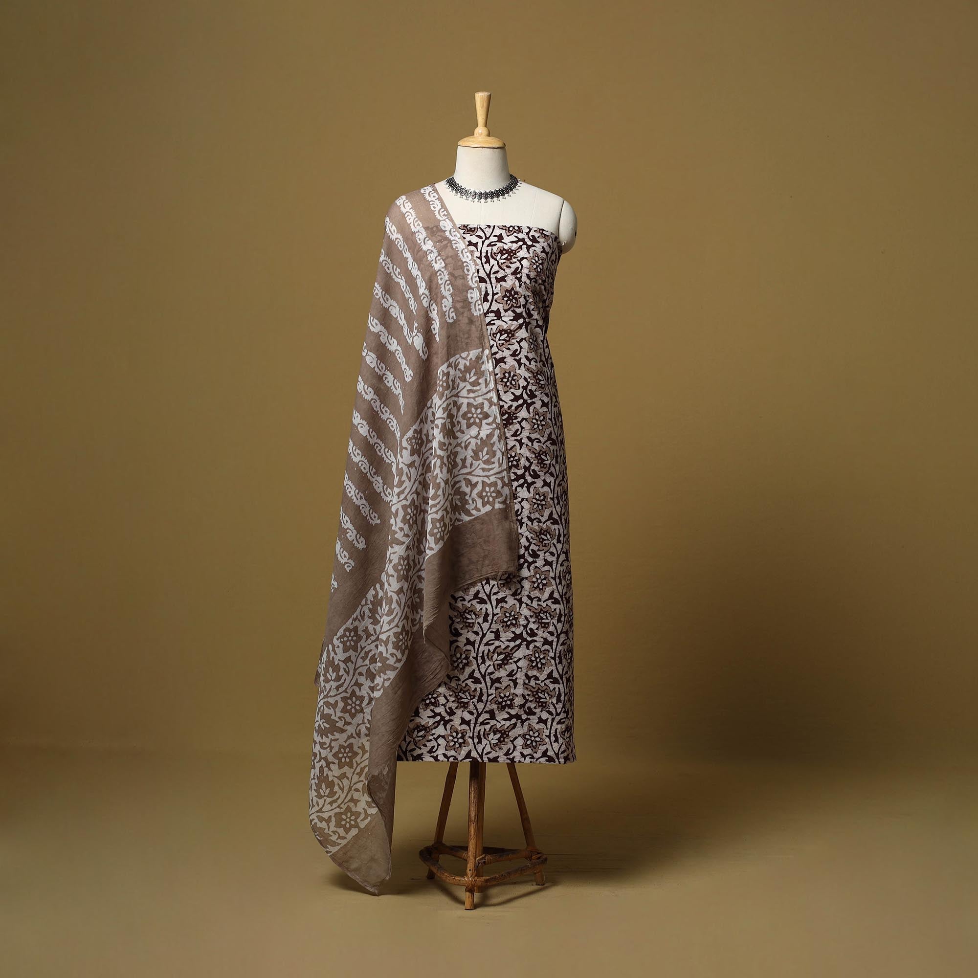 Hand block batik print cotton 3pc unstitched dress material made by skilled artisans from Kutch. Crafted using the centuries-old wax-resist dyeing technique this set includes a kurta piece, matching bottom piece and a dupatta. The traditional designs and cracking effect in batik are often passed down through generations. This set is suitable for daily wear, casual gatherings or relaxed ethnic styling.