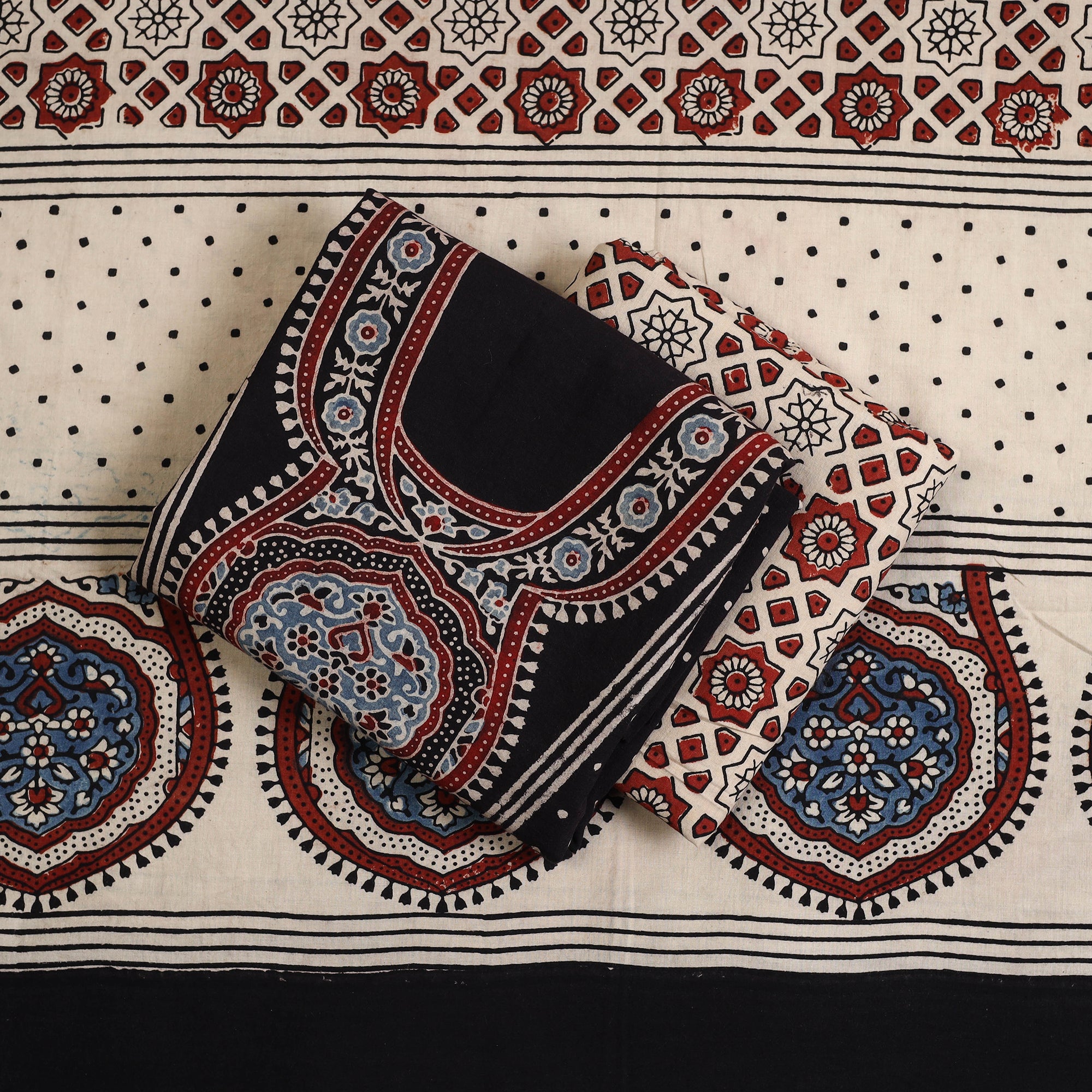 This black hand-block-printed ajrakh cotton dress material brings traditional charm and everyday comfort together in one beautifully handcrafted 3pc set, hand-block-printed by artisans using natural dyes. Known for its detailed patterns and earthy tones, ajrakh reflects Gujarat’s rich textile heritage. The breathable fabric ensures all-day comfort. Style it as a kurta set or mix and match for creative looks, perfect for office wear, casual outings, or festive moments.