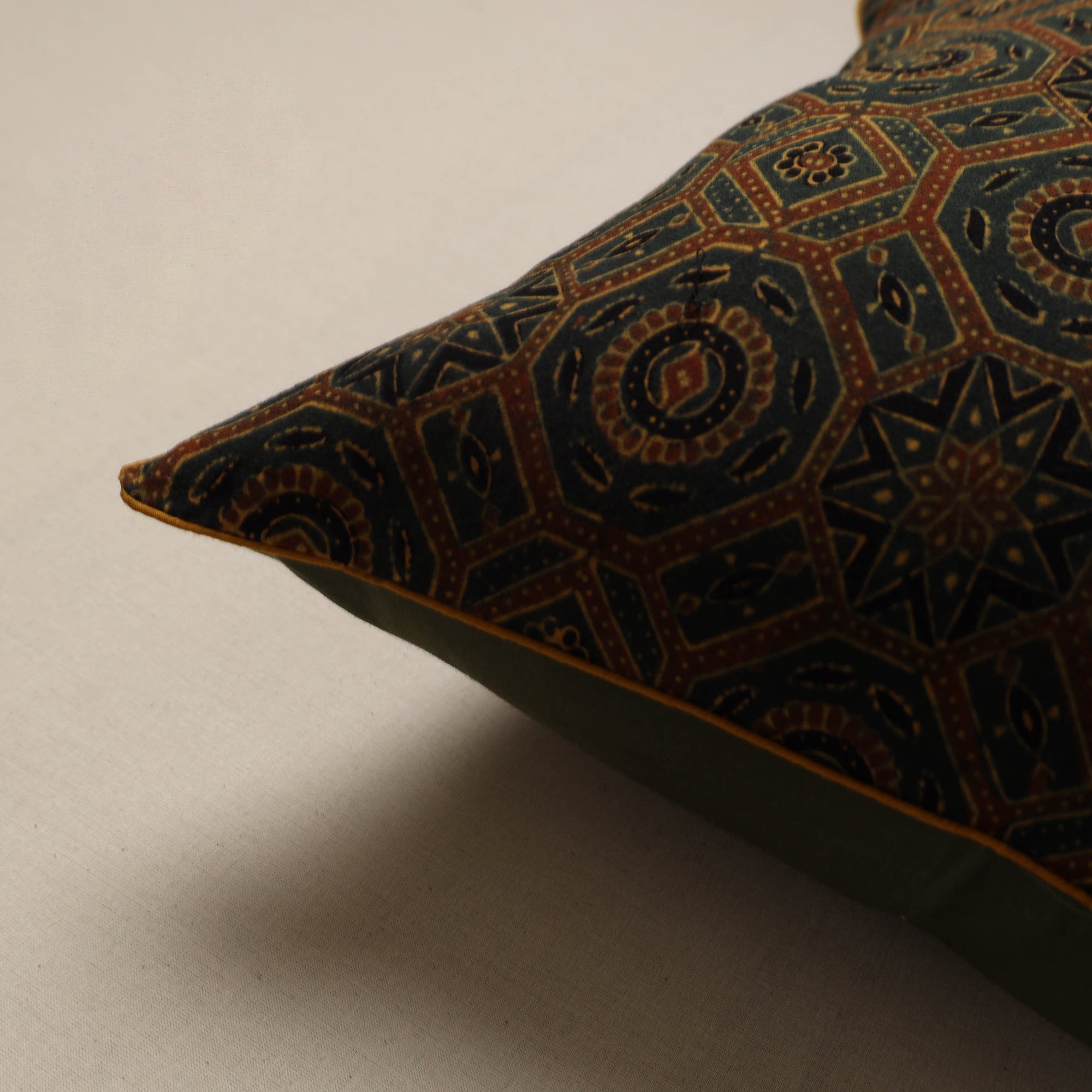 Hand block print ajrakh cushion cover, crafted from cotton and traditional Indian handmade textiles. It blends artistry with comfort, making it perfect for your sofa, bed or lounge area.