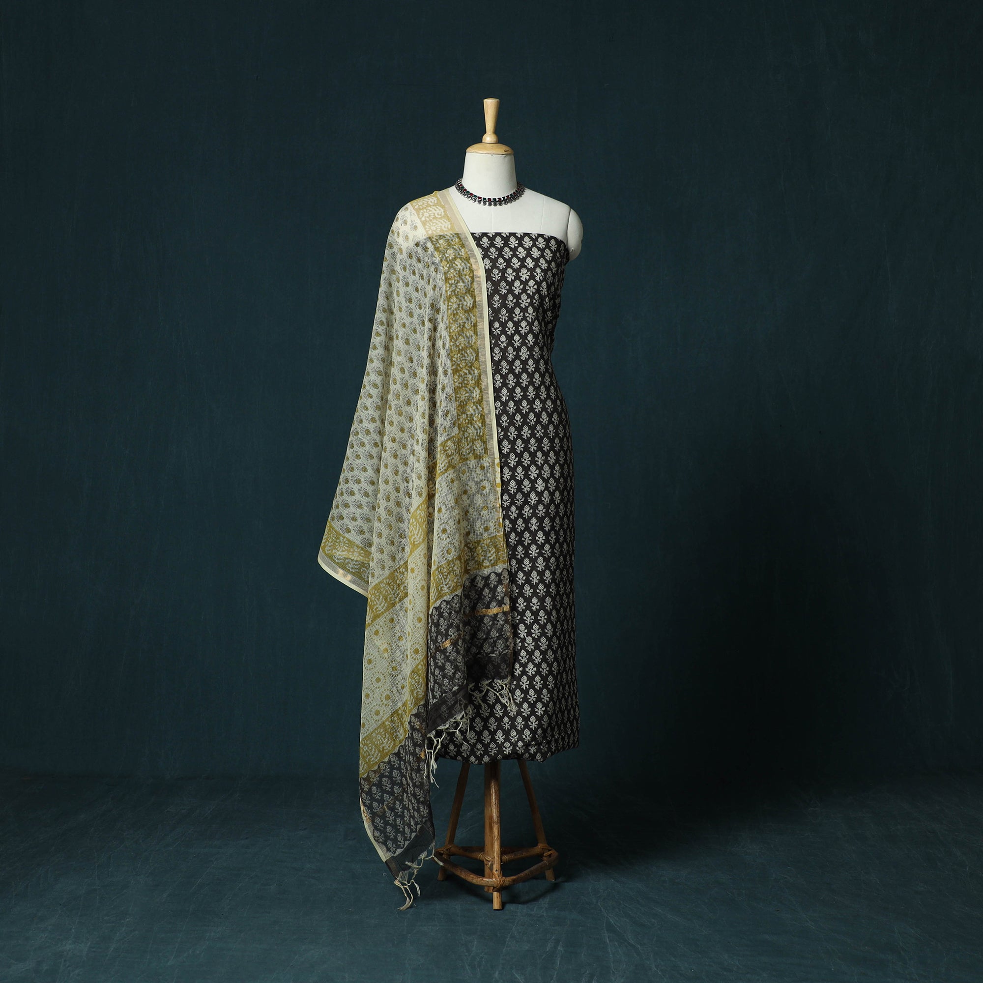 Hand block bagru print natural dyed cotton 3pc unstitched dress material set blends traditional artistry with everyday comfort. It is created using the 400–450 year old Bagru printing technique from Rajasthan, where skilled artisans apply hand-prepared mud resist with intricately carved wooden blocks. Once dyed and washed, the resist reveals distinctive motifs in soft, earthy tones. The kurta and bottom fabrics are made from cotton. The dupatta is crafted in kota doria cotton. Kota Doria is an age-old Indian textile produced in the Kota district of Rajasthan. The doria, or threads, are finely interwoven to create signature check patterns. Its lightweight and sheer texture give it an exquisite grace and elegance of its own. This set suitable for daily wear, workdays, and gatherings.
