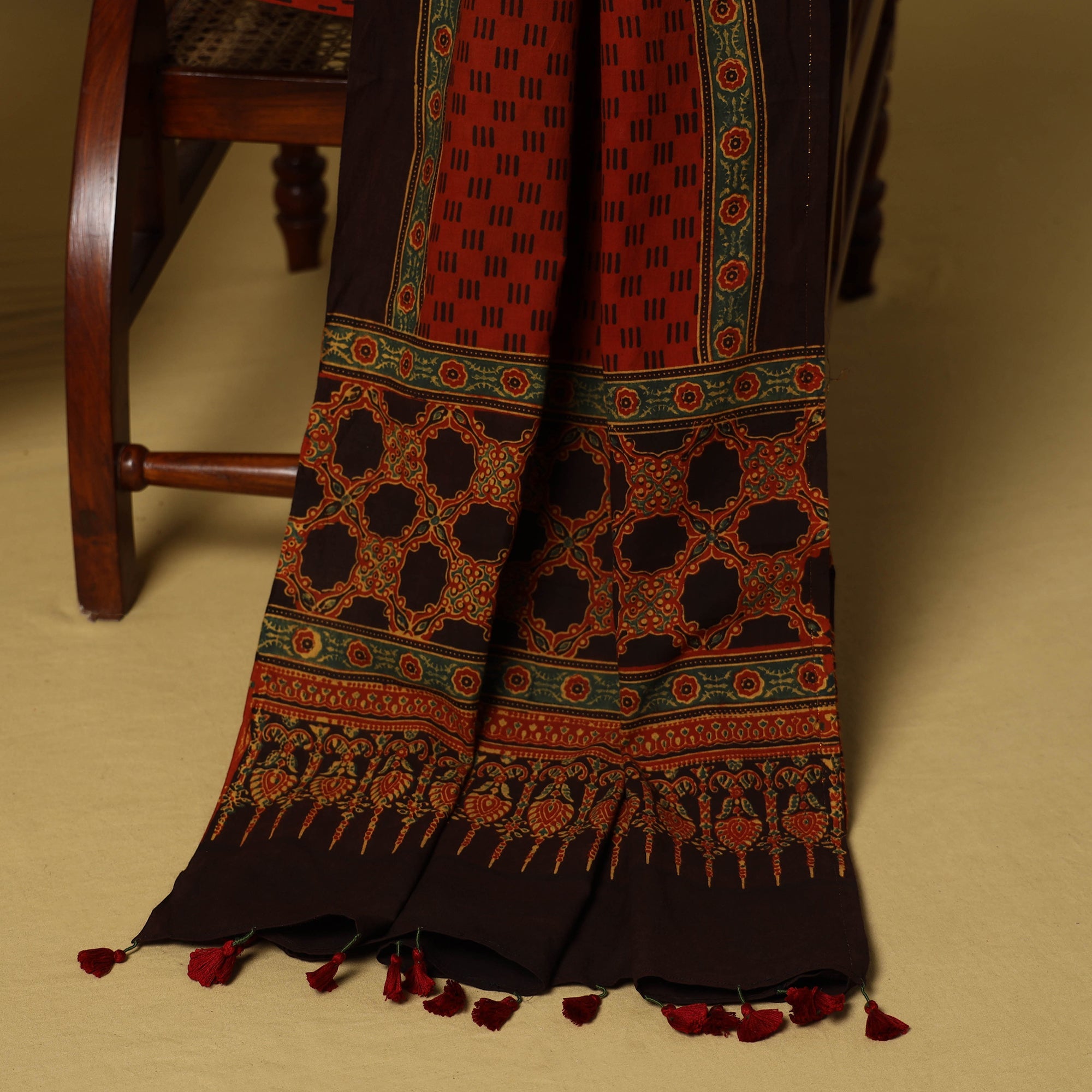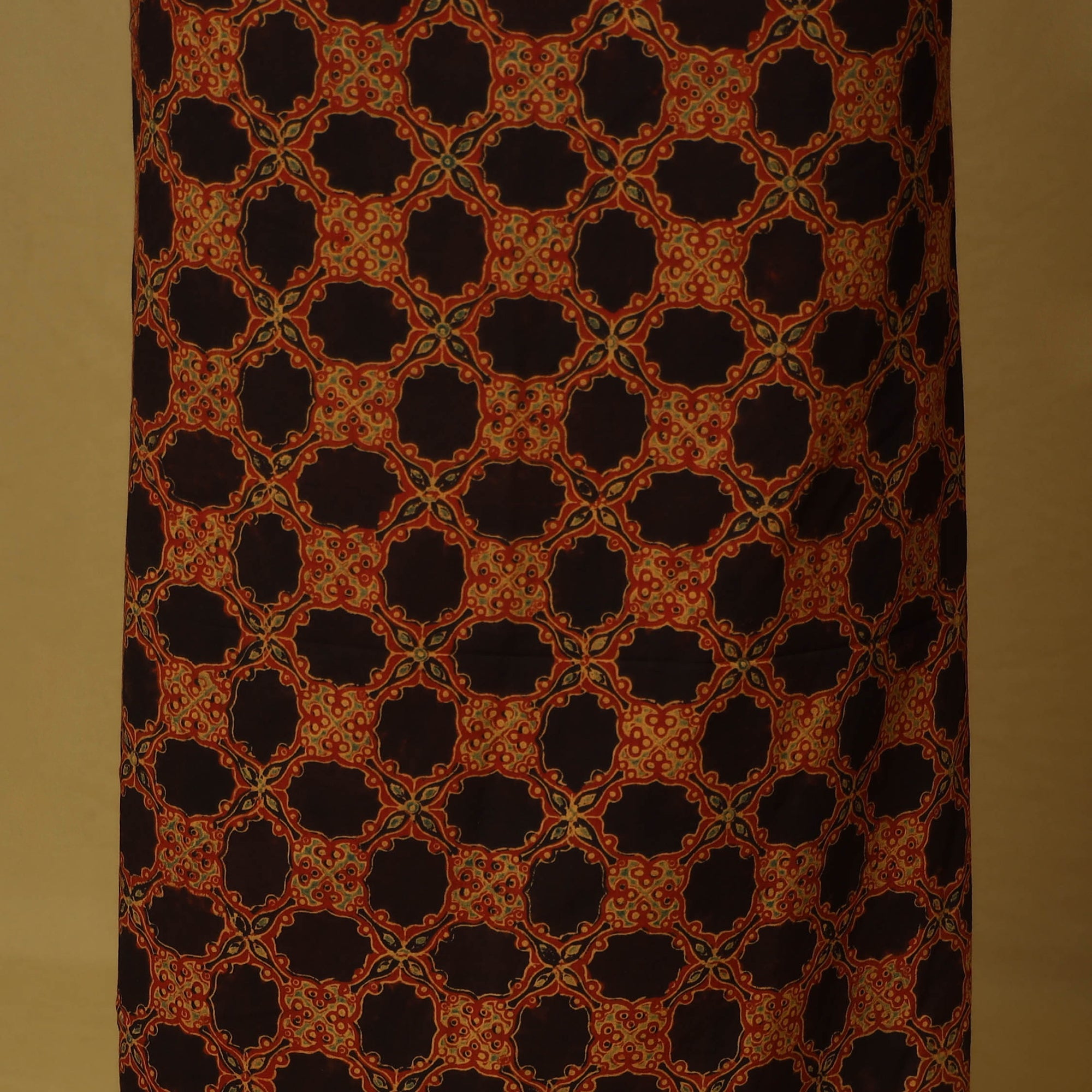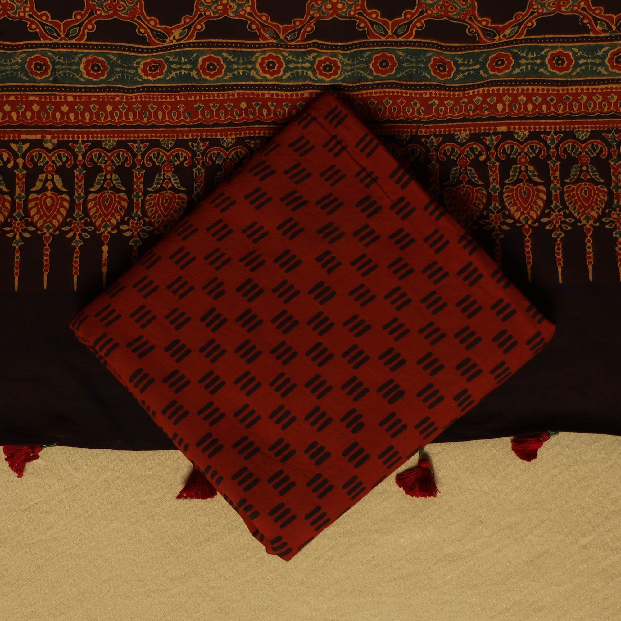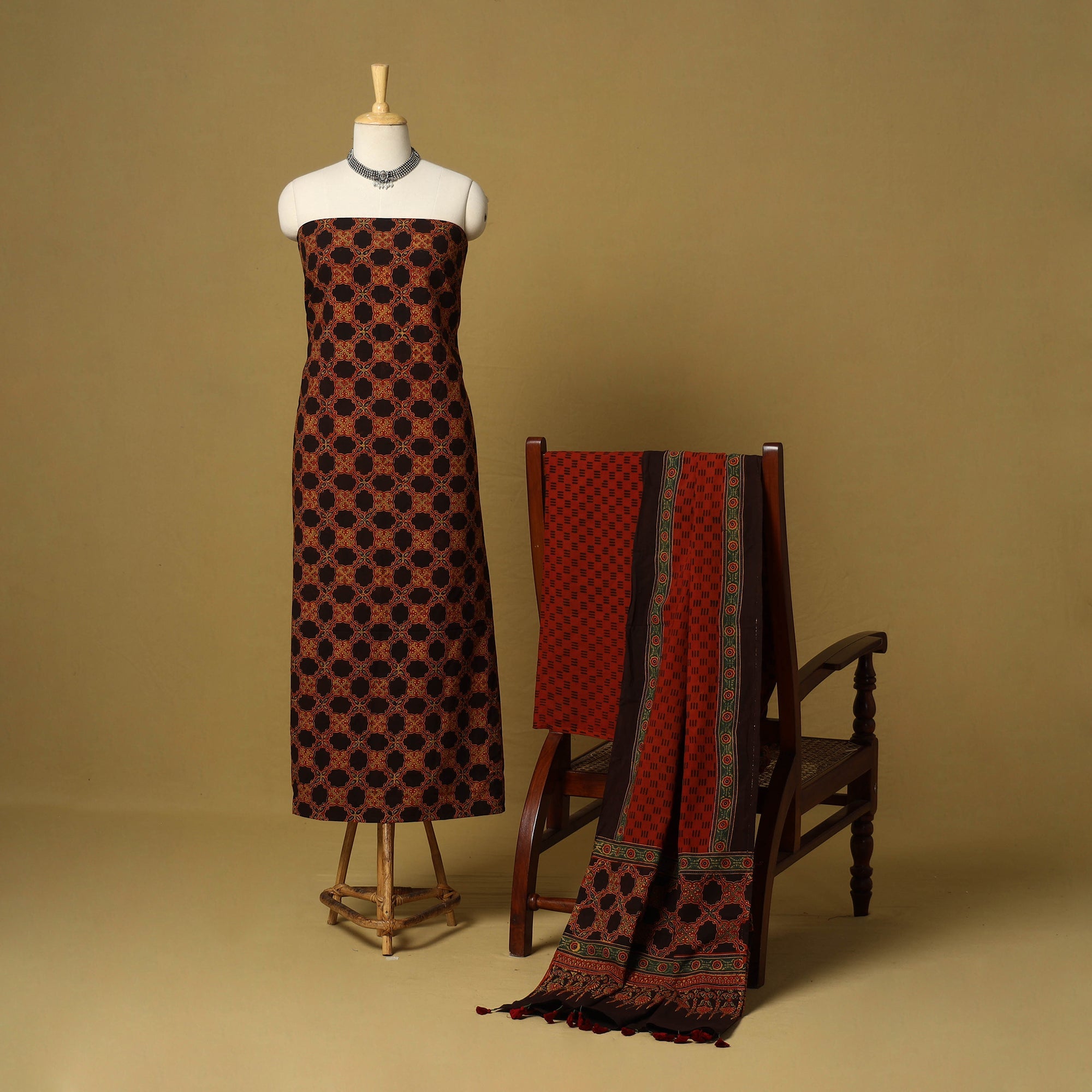 Celebrate the beauty of red hand block print cotton 3pc ajrakh dress material. Crafted in Kutch by Sufiyan Khatri, it features hand block prints and natural dyes, keeping the tradition of ajrakh alive. The set includes top, bottom, and dupatta, all in cotton, making it perfect for comfortable yet stylish wear.