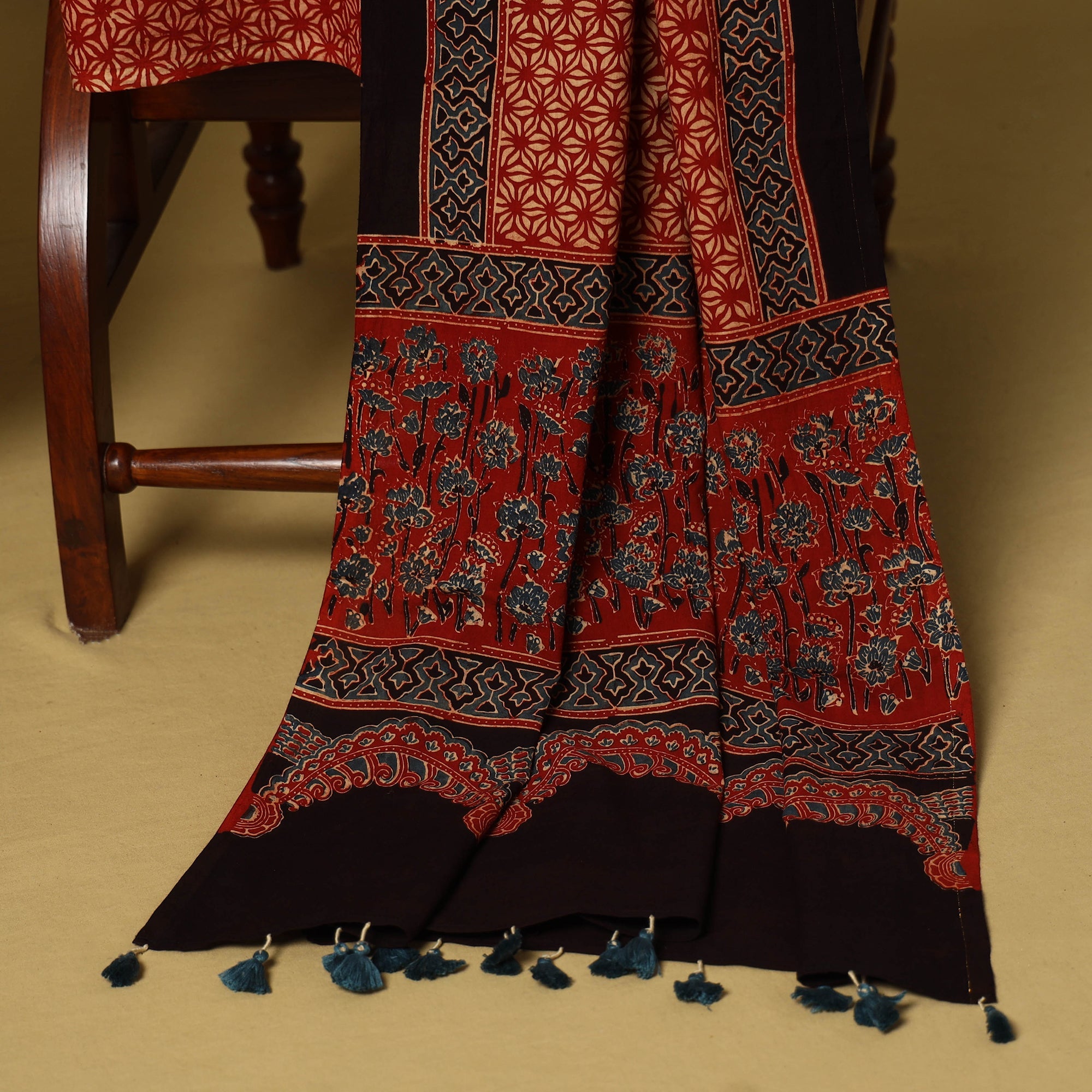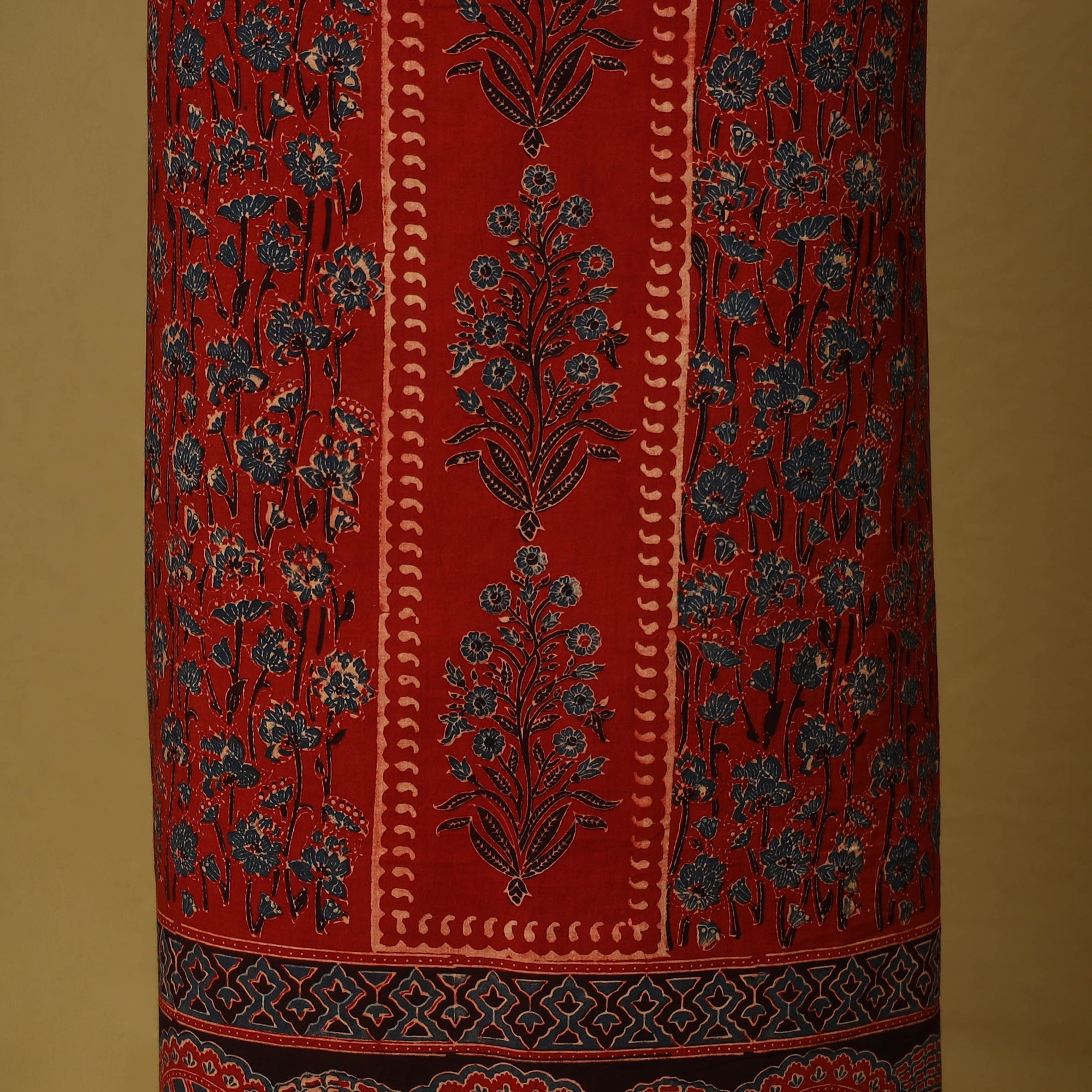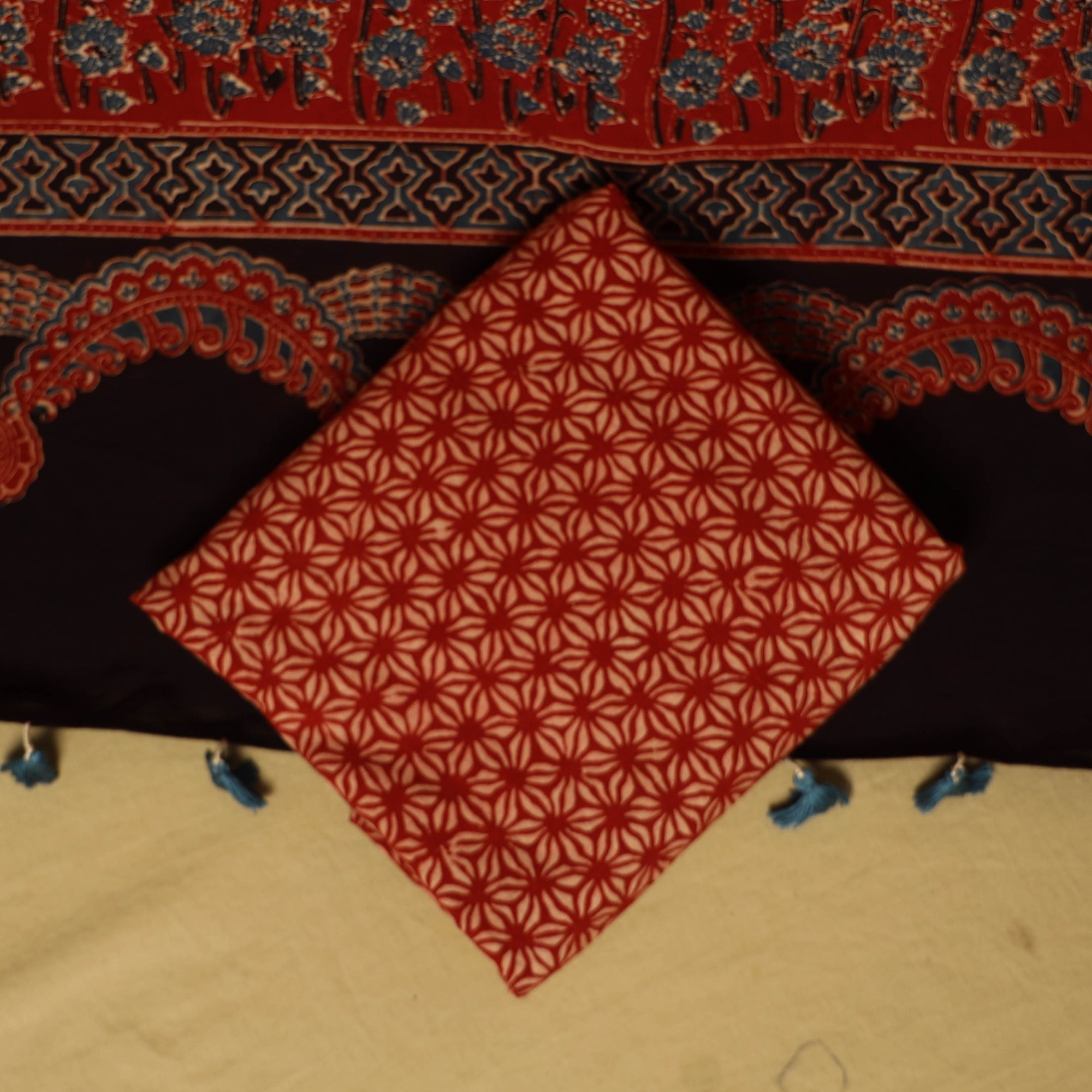 Celebrate the beauty of red hand block print cotton 3pc ajrakh dress material. Crafted in Kutch by Sufiyan Khatri, it features hand block prints and natural dyes, keeping the tradition of ajrakh alive. The set includes top, bottom, and dupatta, all in cotton, making it perfect for comfortable yet stylish wear.