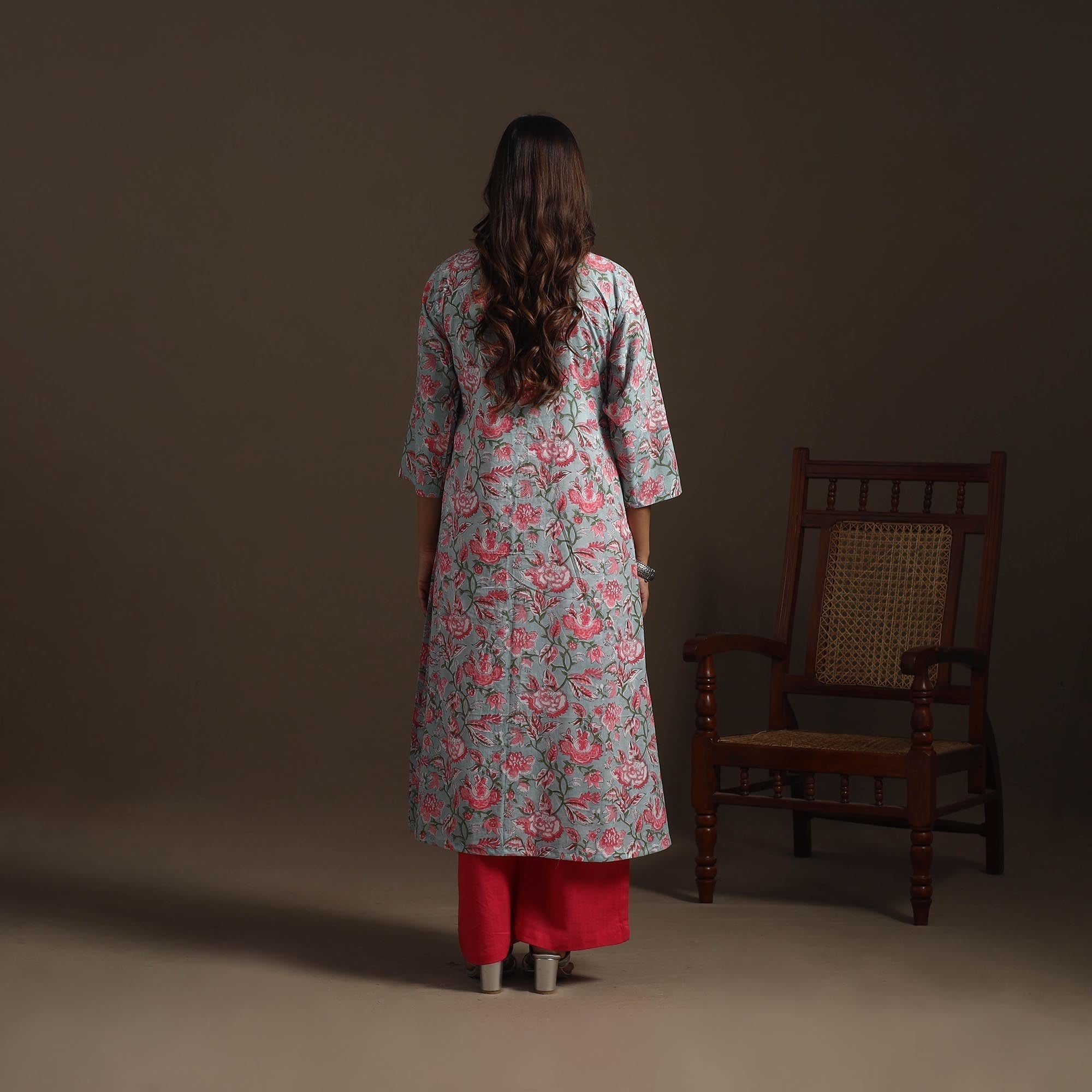 Green hand block print a-line sanganeri kurta for women. Crafted from soft cotton, it features delicate floral motifs inspired by the traditional craft of Sanganer, Rajasthan. Designed for a relaxed fit with a practical side pocket, it’s ideal for both casual outings and intimate gatherings.