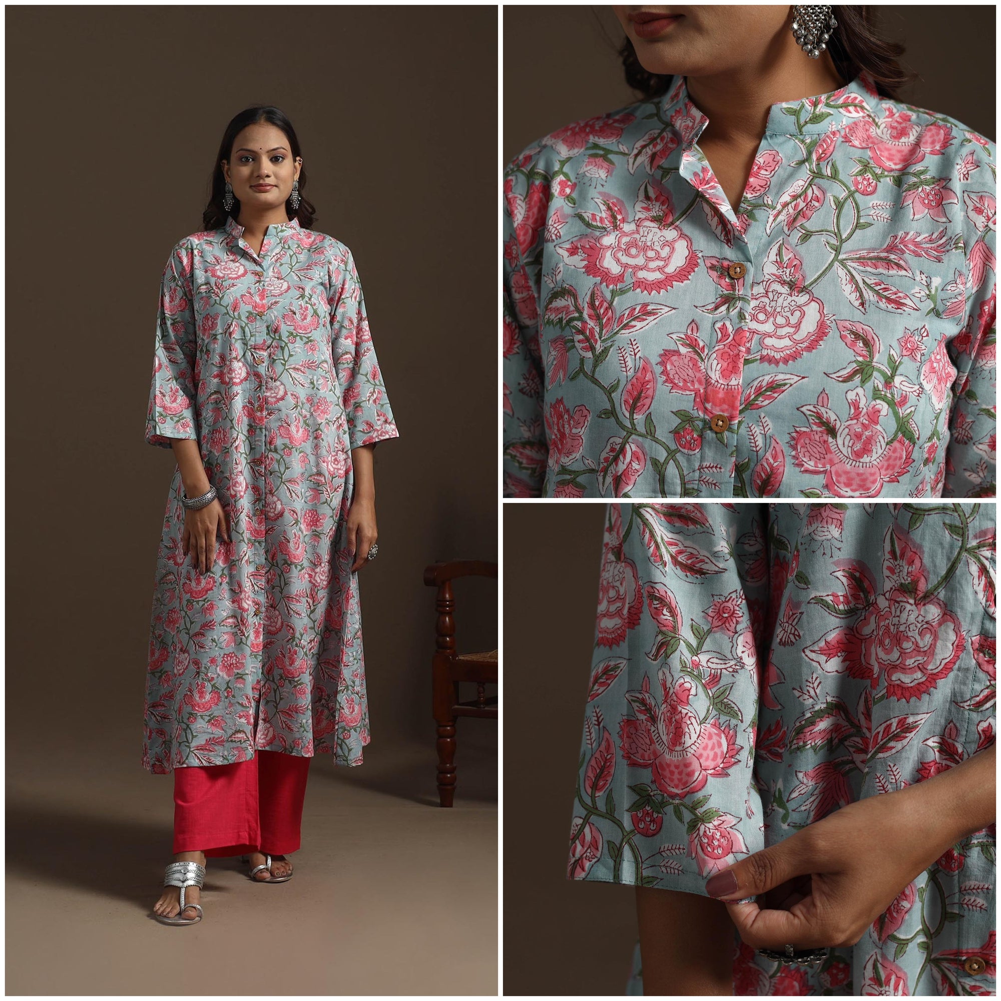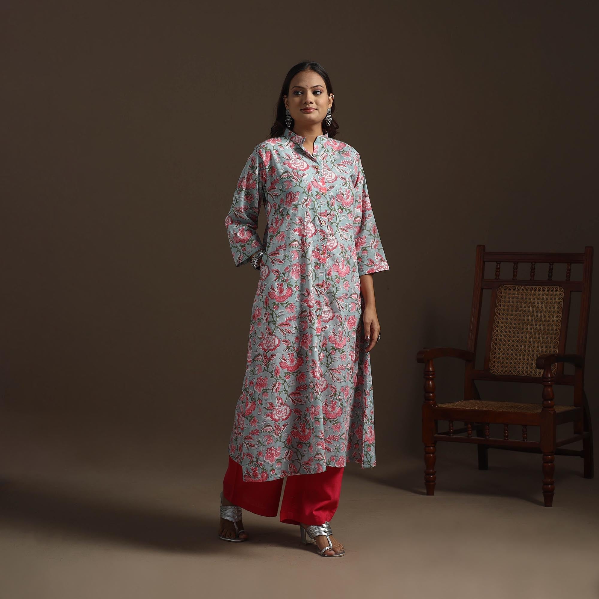 Hand block print a-line sanganeri kurta for women. Crafted from soft cotton, it features delicate floral motifs inspired by the traditional craft of Sanganer, Rajasthan. Designed for a relaxed fit with a practical side pocket, it’s ideal for both casual outings and intimate gatherings.