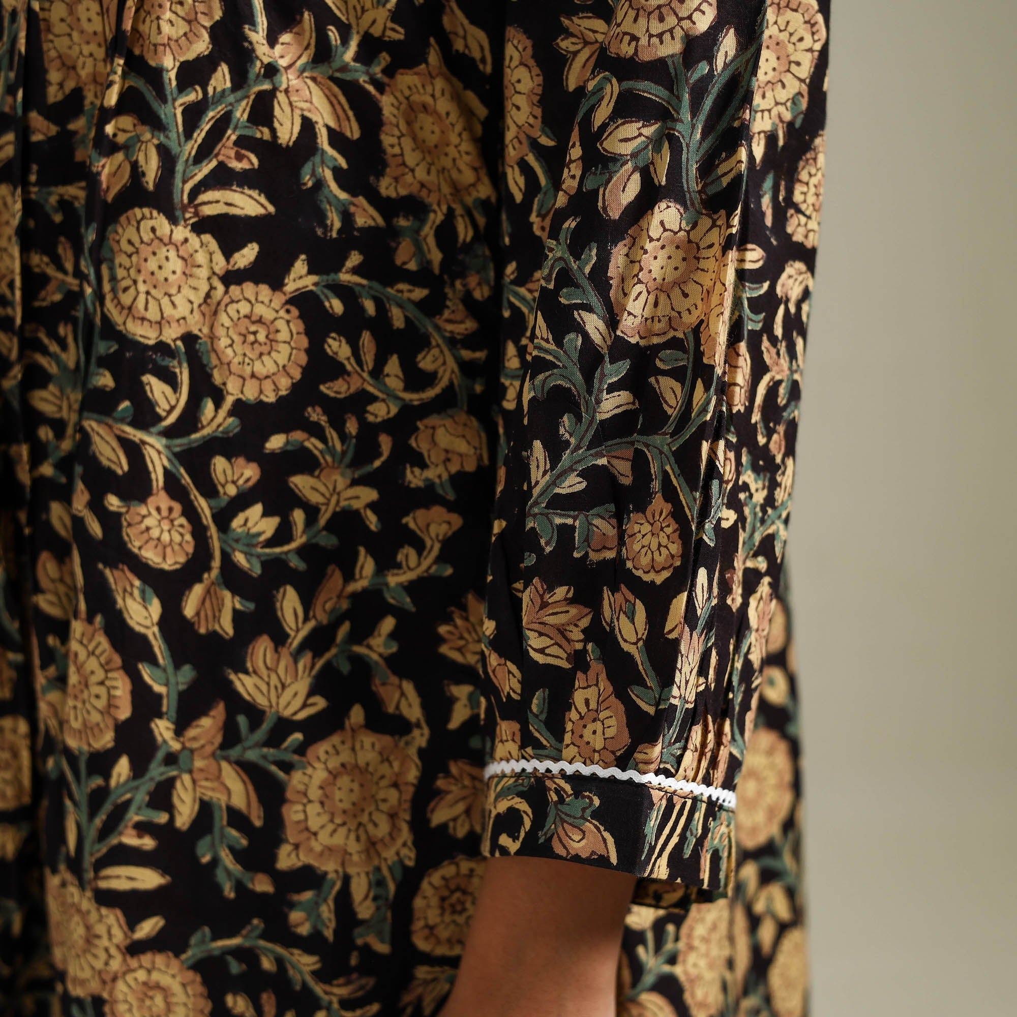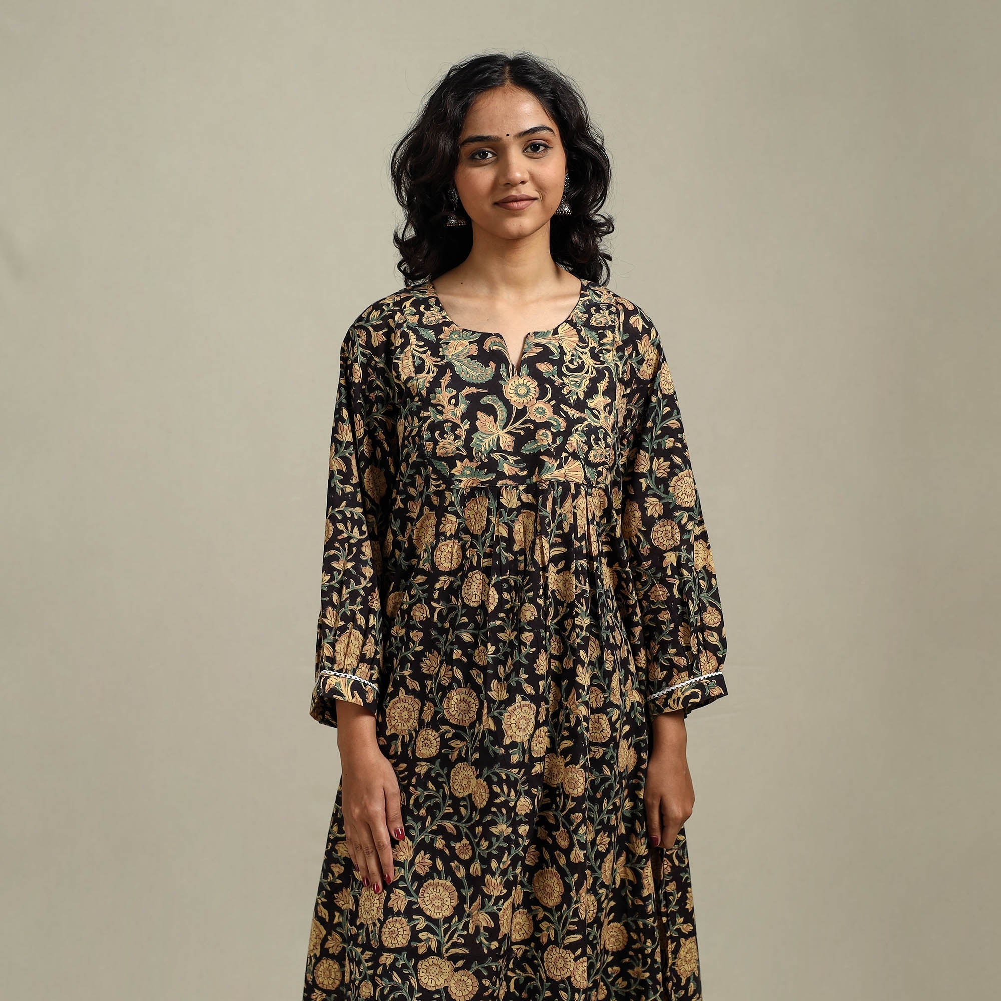 Black sanganeri hand block print women’s kurta showcases sanganeri hand block printing, a centuries-old craft from Rajasthan practiced for over 500 years. Made from pure cotton, it features delicate floral patterns printed using hand-carved wooden blocks and bleed-free VAT dyes. Designed in a A-line silhouette with a functional side pocket, it offers comfort for everyday wear as well as special occasions.