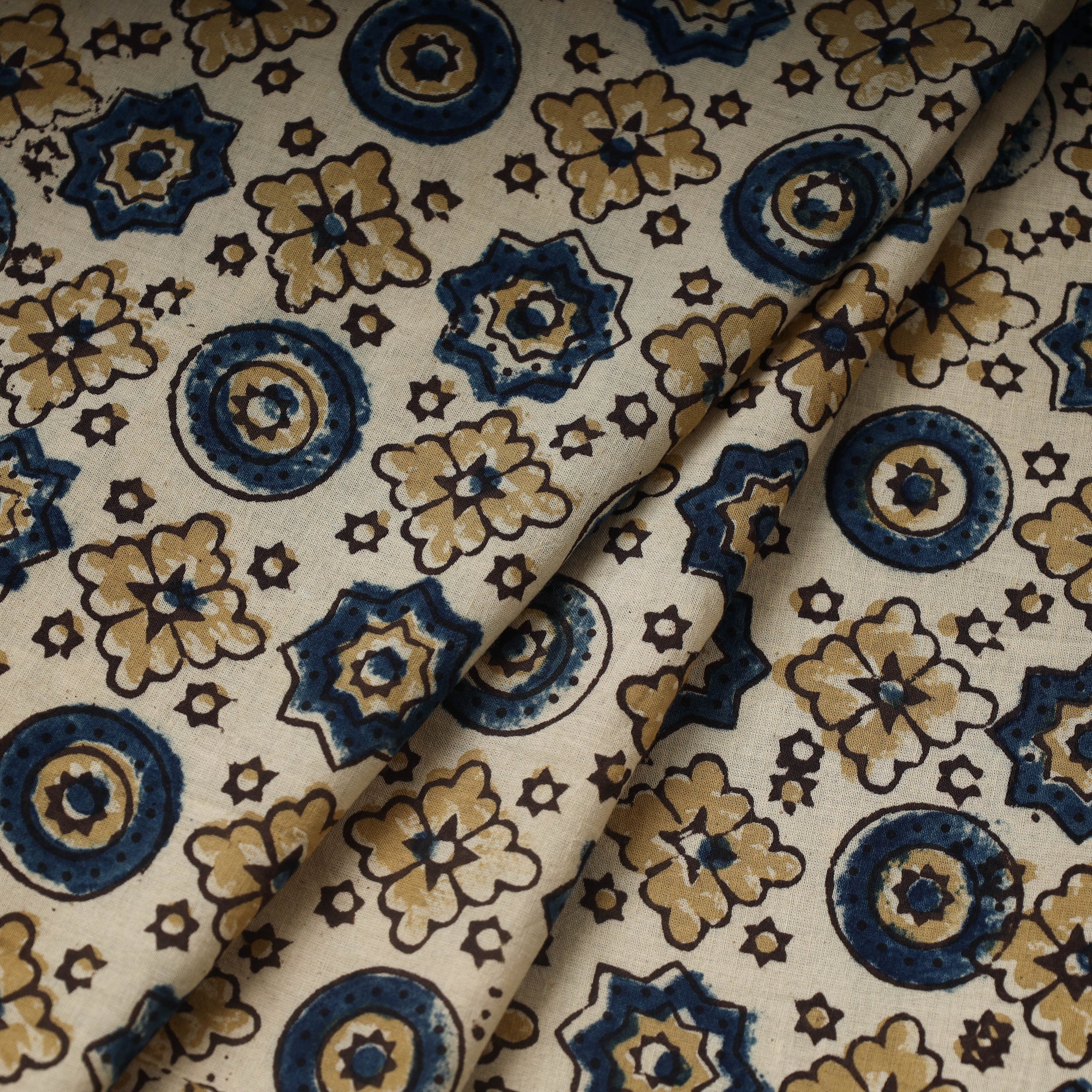 This beige ajrakh cotton fabric is hand block printed in Kutch, Gujarat using natural dyes and centuries-old techniques. Known for its deep hues and detailed patterns, Ajrakh is a heritage craft that blends beauty with sustainability. The breathable cotton makes it ideal for stitching kurtas, dresses, shirts, or home accessories. Each piece reflects the skill of artisans who preserve this traditional craft.