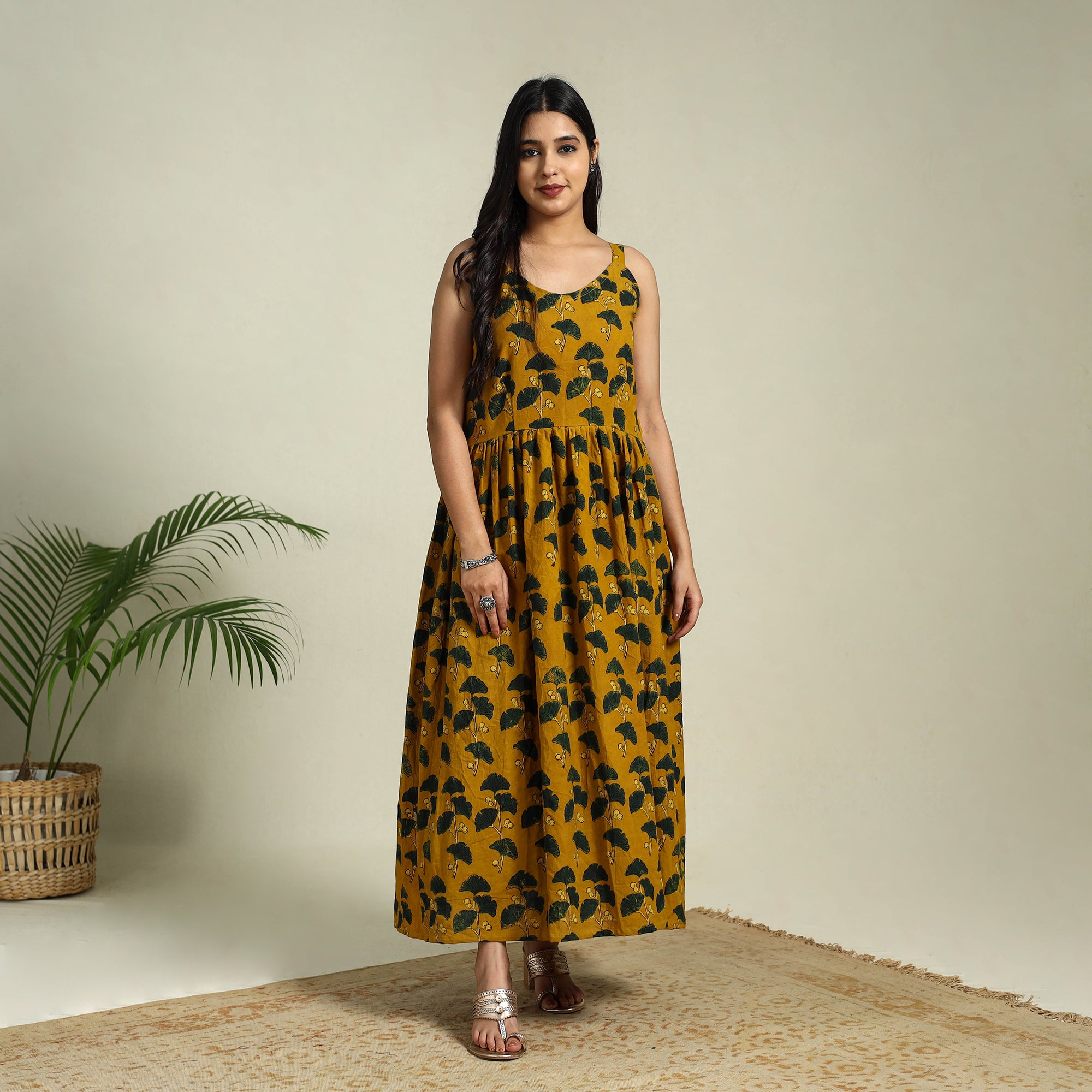 This yellow ajrakh block printed cotton sleeveless flared dress beautifully blends tradition and comfort. Crafted using natural dyes, it feels soft and breathable all day long. Ideal for wearing at home, at family gatherings, on small outings, or as a thoughtful gift for someone special.