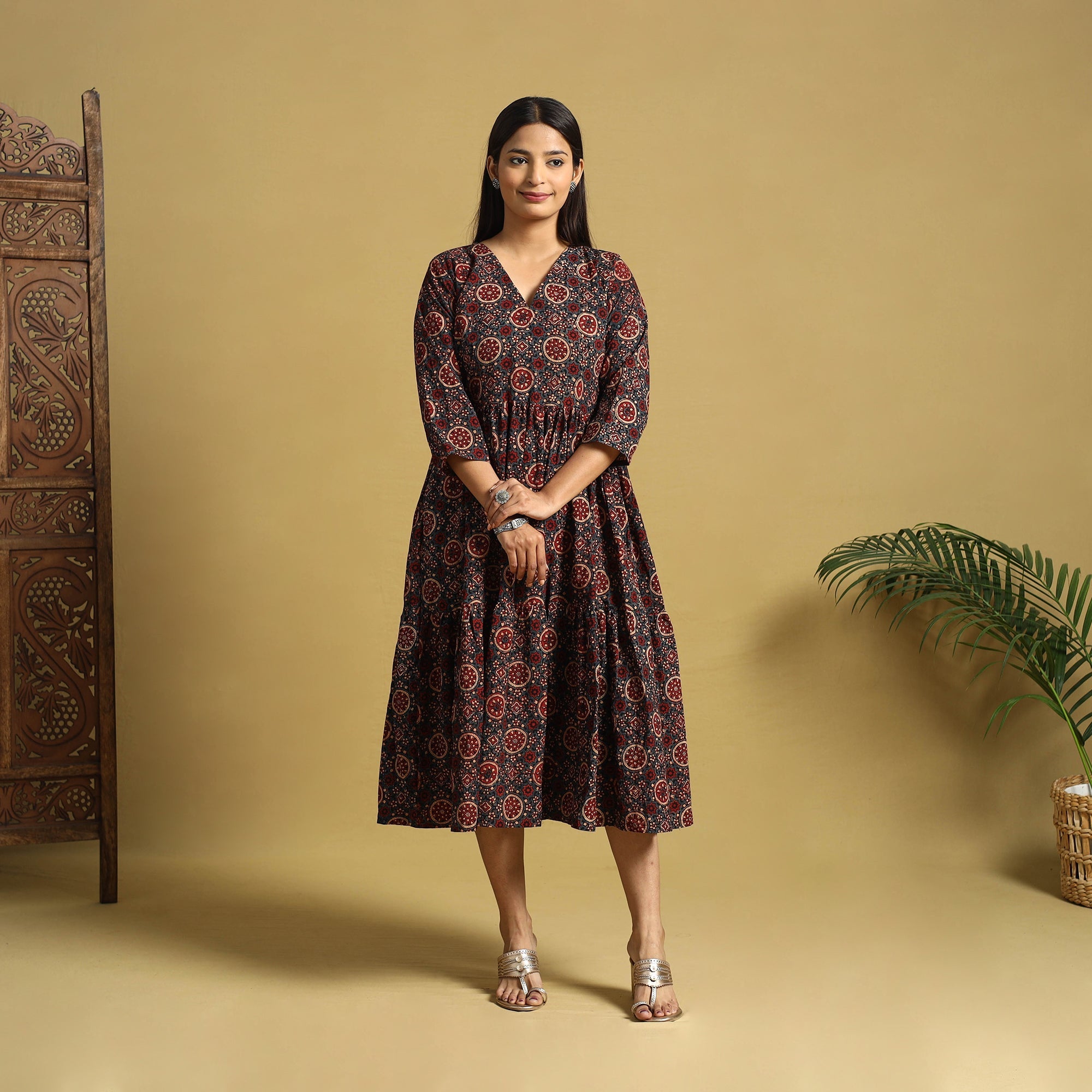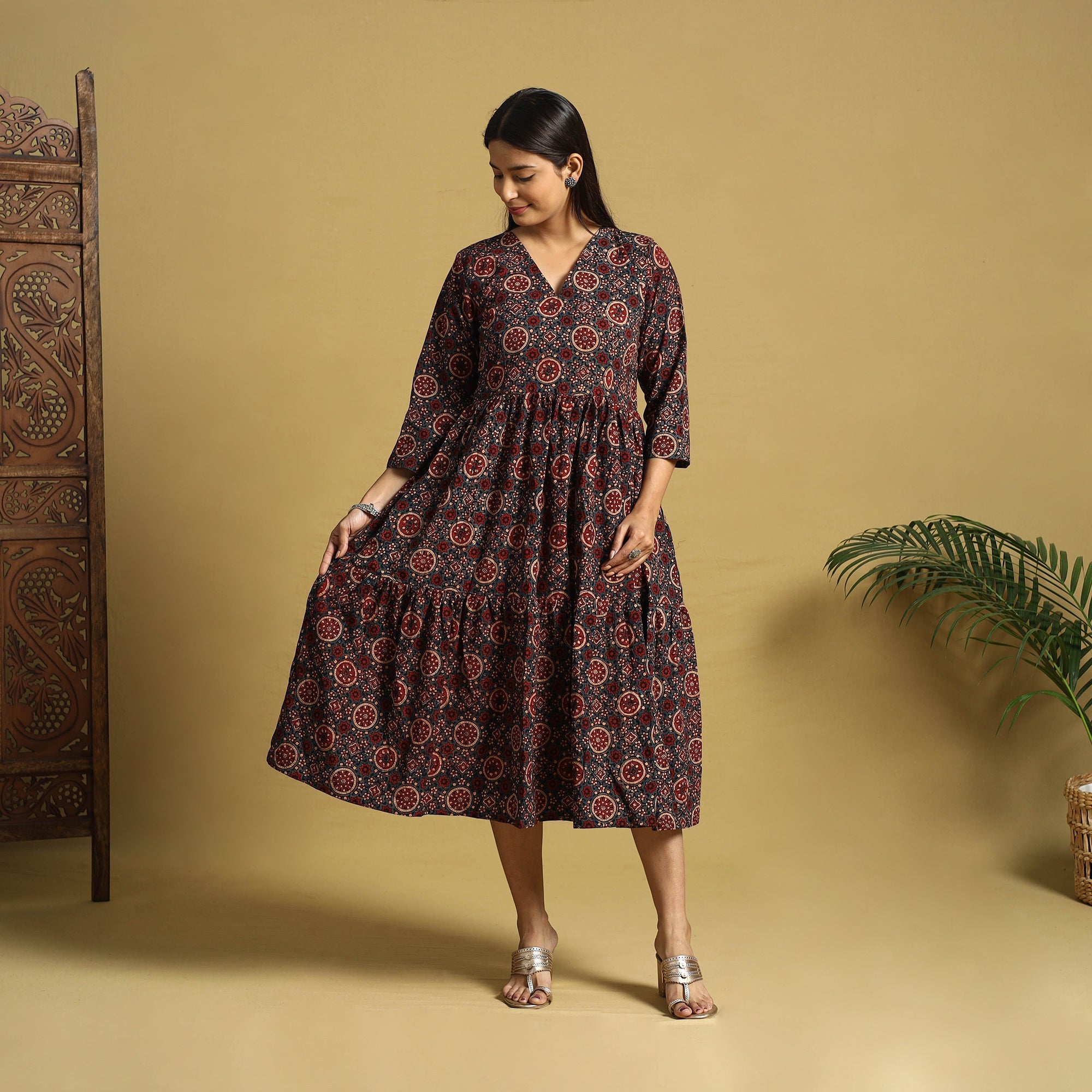 This blue ajrakh printed cotton flared dress beautifully brings together heritage and comfort. Handcrafted using natural dyes, it feels soft, light, and breathable all day. A perfect choice for relaxed homewear, casual gatherings, mini outings, or even as a meaningful gift for your loved ones.