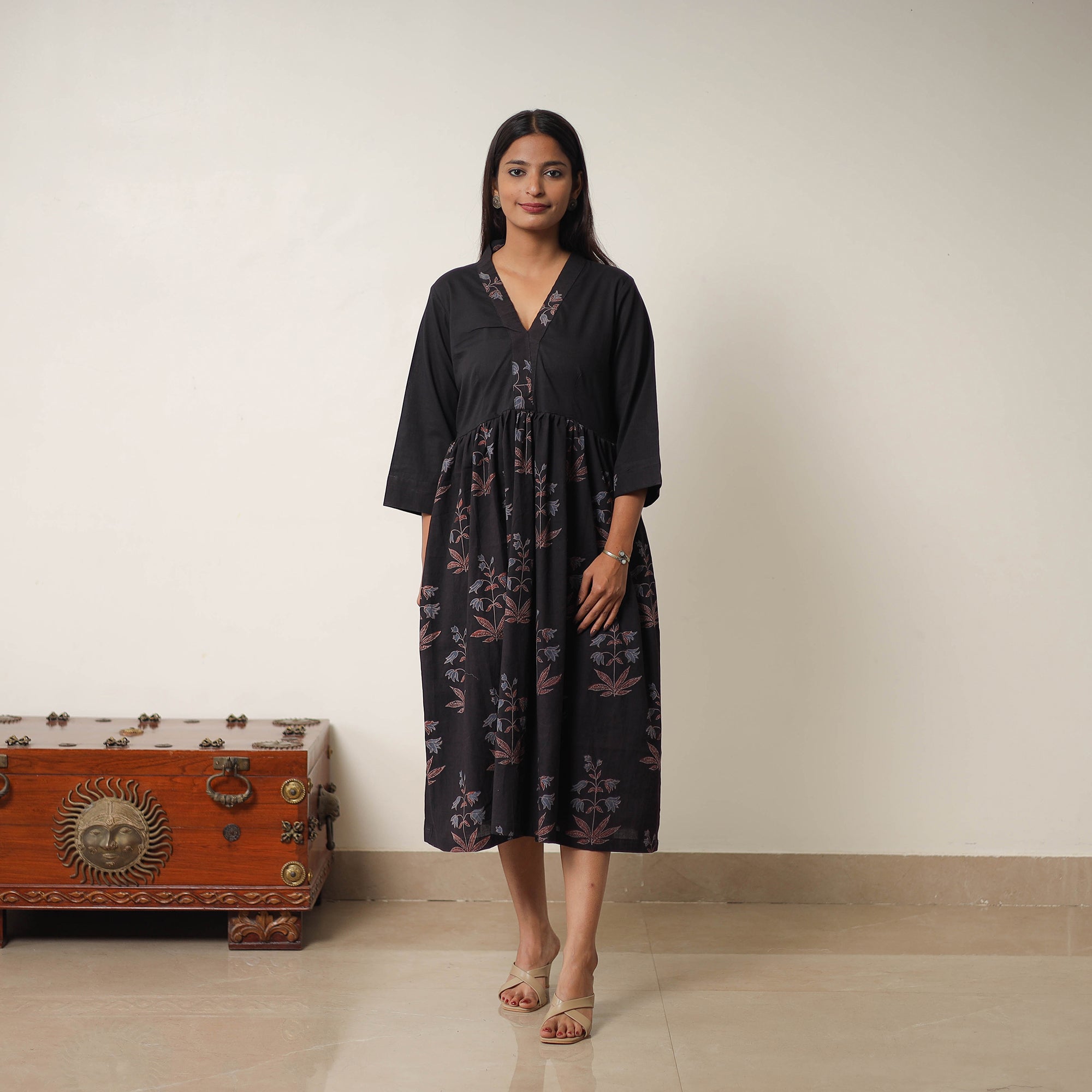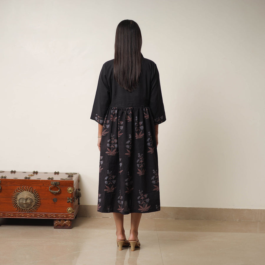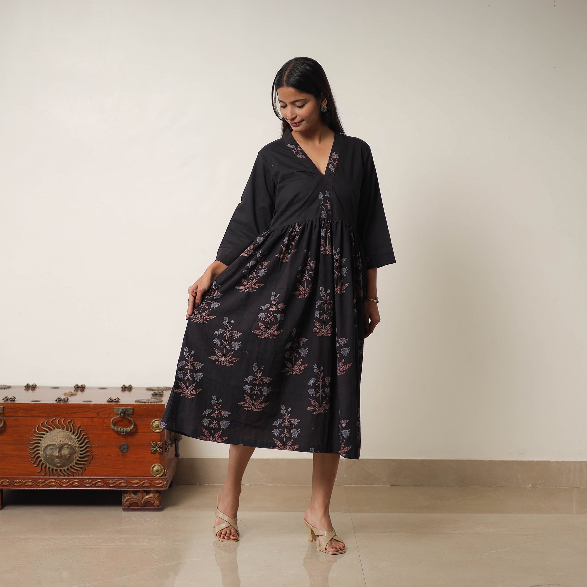 Step into the timeless elegance of our black hand block print cotton flared gher ajrakh dress, crafted from natural dyed cotton for ultimate comfort and breathability. This flared dress features intricate traditional motifs inspired by the cultural heritage of Gujarat and Rajasthan. Ideal for both daily wear and special occasions, it’s perfect for showcasing your love for sustainable, artisanal fashion.