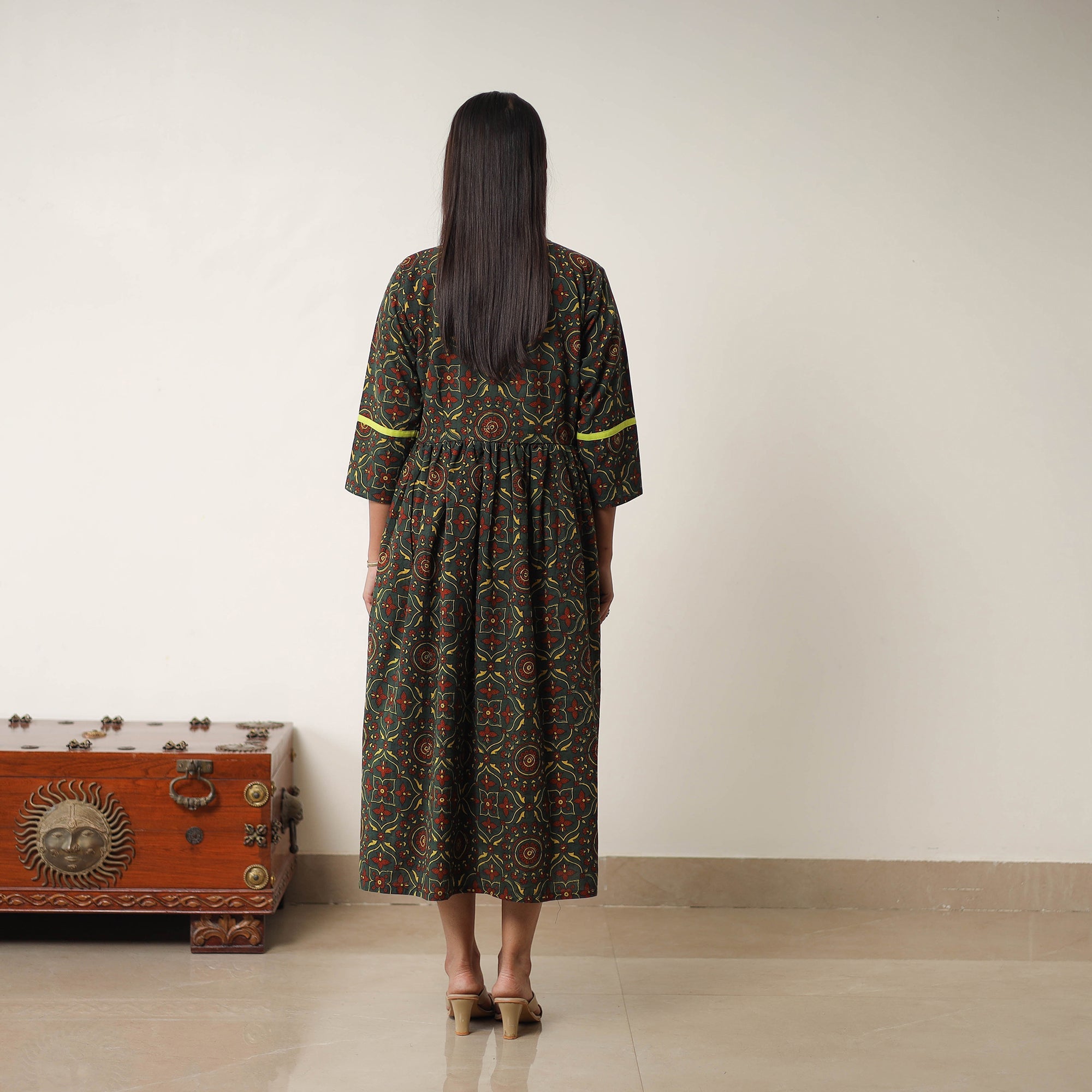 Step into the timeless elegance of our green hand block print cotton flared gher ajrakh dress, crafted from natural dyed cotton for ultimate comfort and breathability. This flared dress features intricate traditional motifs inspired by the cultural heritage of Gujarat and Rajasthan. Ideal for both daily wear and special occasions, it’s perfect for showcasing your love for sustainable, artisanal fashion.
