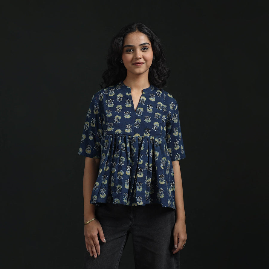 | Material | Ajrakh hand block print natural dyed pure cotton women’s crop top featuring half sleeves. It is created using the traditional resist block printing technique. This ancient craft is estimated to be over 4,500 years old and is known for its intricate patterns and deep natural colours. The breathable fabric ensures all-day comfort and pairs beautifully with skirts or pants. |