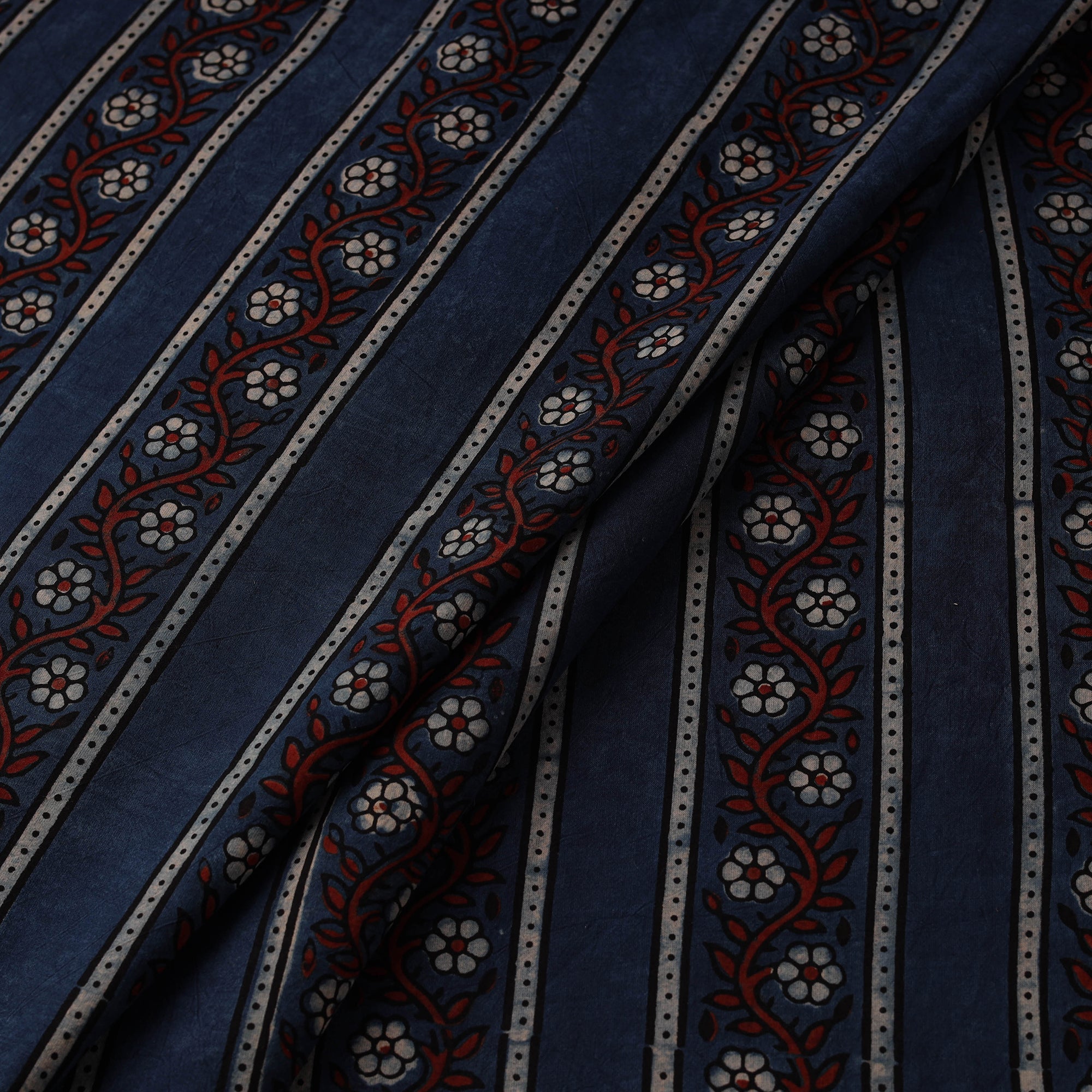 Blue ajrakh fabric by artisan Riyaz Abdulmajid Khatri is crafted using natural-dyeing and resist block-printing techniques. This ancient craft is estimated to be around 4,500 years old. The Ajrakh artisans in India originally migrated from Sindh to the Kutch region of Gujarat and to Barmer in Rajasthan. Ajrakh is also the traditional attire of the Maldhari pastoral community of Bhuj. The process is long and detailed, involving multiple stages where each layer of colour is printed only after a resting period, allowing the cloth to absorb the dye fully. Made from cotton, it is ideal for creating kurtas, shirts, dresses or even home decor items.