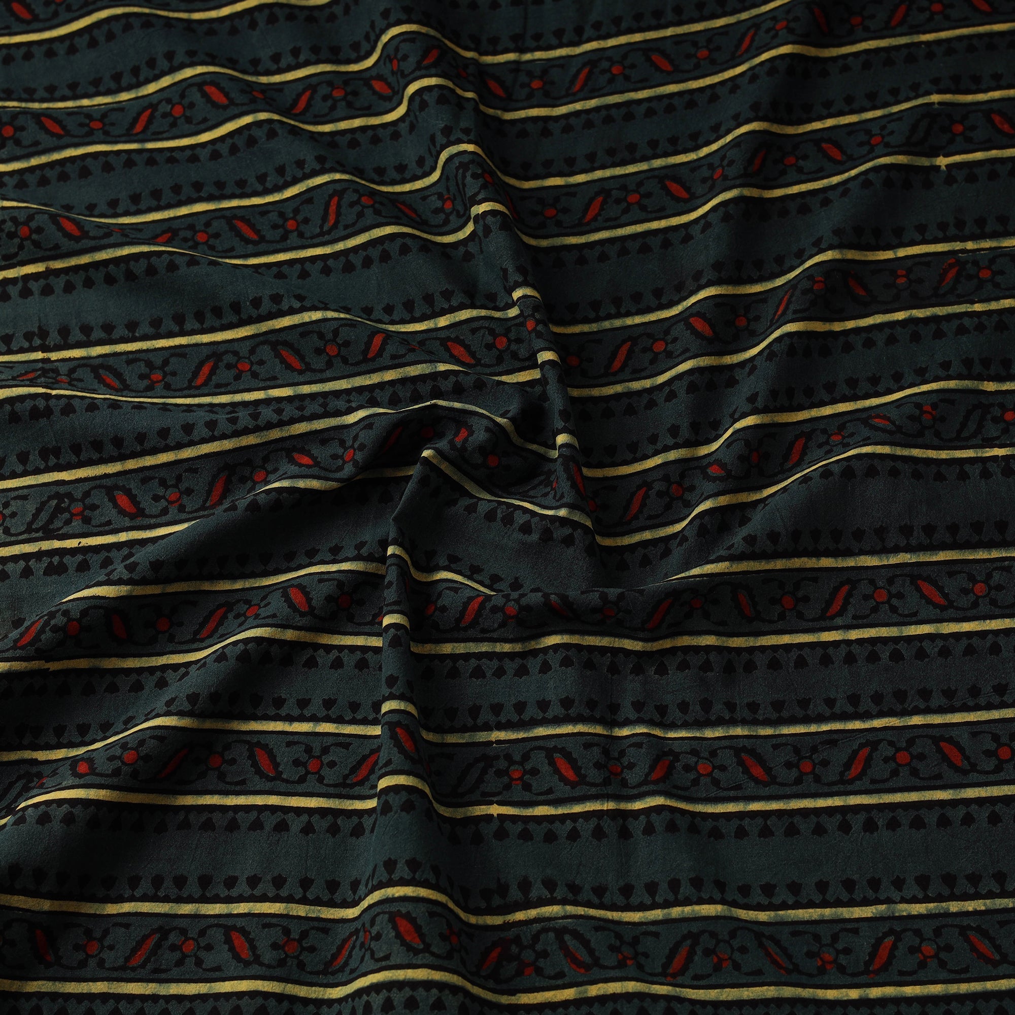 Ajrakh fabric by artisan Riyaz Abdulmajid Khatri is crafted using natural-dyeing and resist block-printing techniques. This ancient craft is estimated to be around 4,500 years old. The Ajrakh artisans in India originally migrated from Sindh to the Kutch region of Gujarat and to Barmer in Rajasthan. Ajrakh is also the traditional attire of the Maldhari pastoral community of Bhuj. The process is long and detailed, involving multiple stages where each layer of colour is printed only after a resting period, allowing the cloth to absorb the dye fully. Made from cotton, it is ideal for creating kurtas, shirts, dresses or even home decor items.