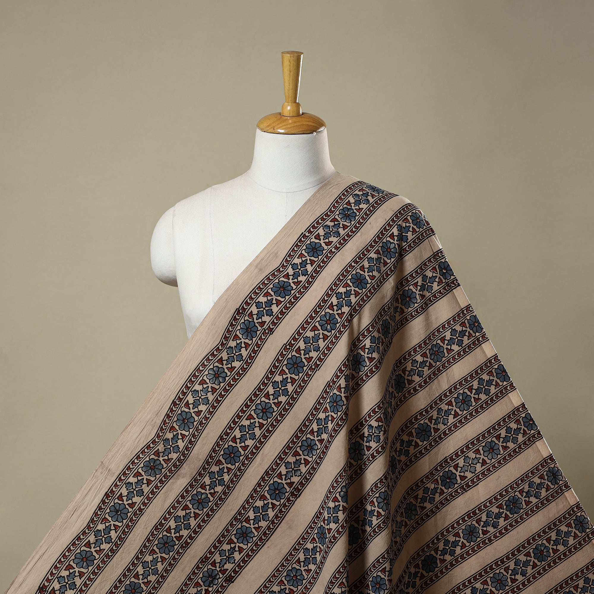 Ajrakh fabric by artisan Riyaz Abdulmajid Khatri is crafted using natural-dyeing and resist block-printing techniques. This ancient craft is estimated to be around 4,500 years old. The Ajrakh artisans in India originally migrated from Sindh to the Kutch region of Gujarat and to Barmer in Rajasthan. Ajrakh is also the traditional attire of the Maldhari pastoral community of Bhuj. The process is long and detailed, involving multiple stages where each layer of colour is printed only after a resting period, allowing the cloth to absorb the dye fully. Made from cotton, it is ideal for creating kurtas, shirts, dresses or even home decor items.