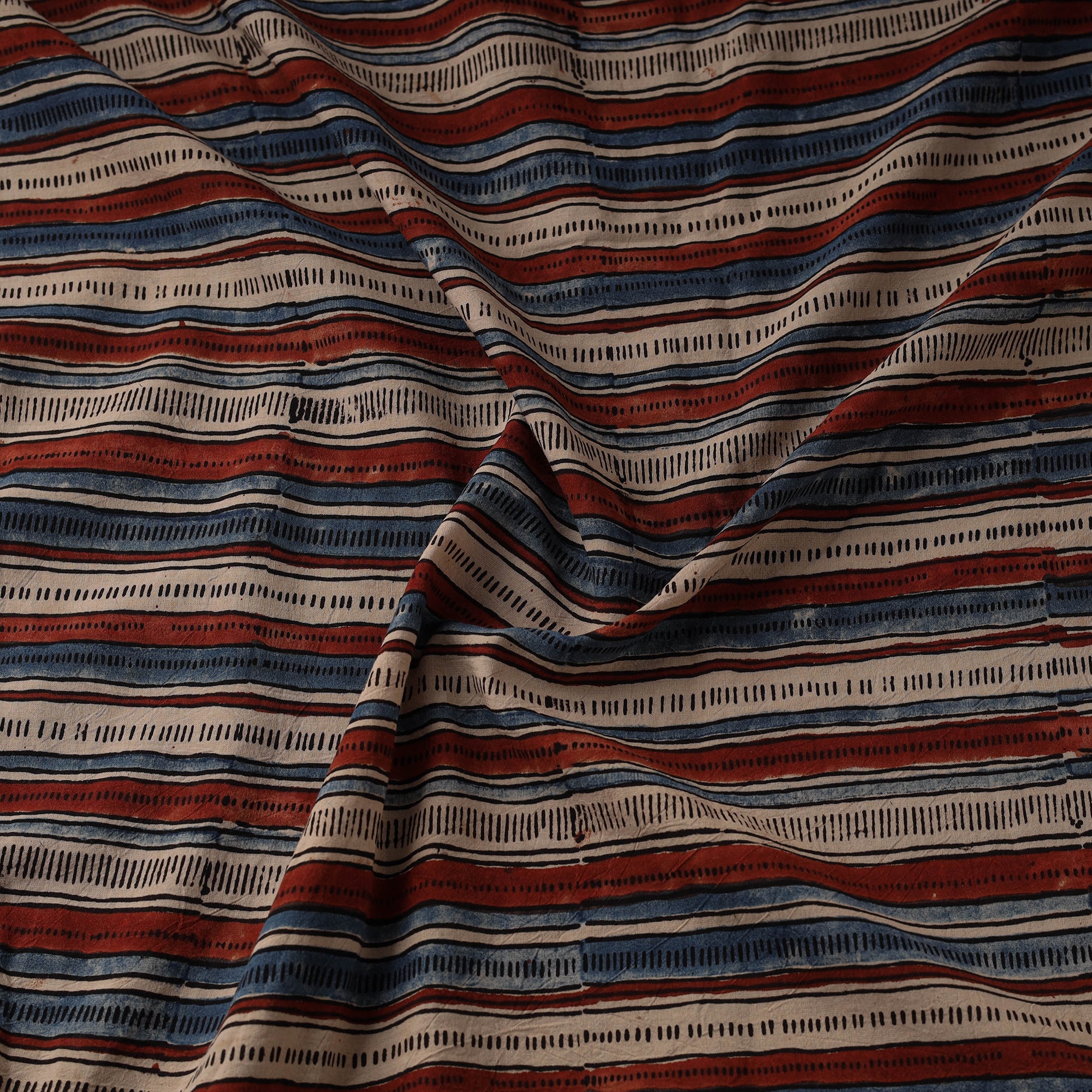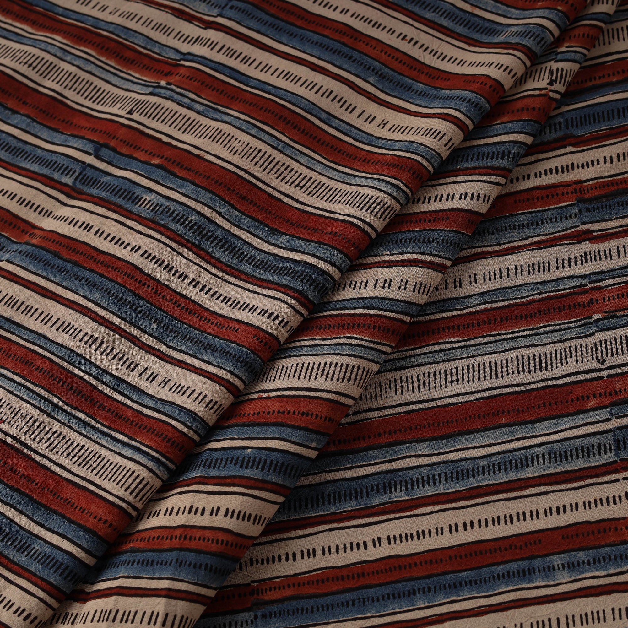 Ajrakh fabric by artisan Riyaz Abdulmajid Khatri is crafted using natural-dyeing and resist block-printing techniques. This ancient craft is estimated to be around 4,500 years old. The Ajrakh artisans in India originally migrated from Sindh to the Kutch region of Gujarat and to Barmer in Rajasthan. Ajrakh is also the traditional attire of the Maldhari pastoral community of Bhuj. The process is long and detailed, involving multiple stages where each layer of colour is printed only after a resting period, allowing the cloth to absorb the dye fully. Made from cotton, it is ideal for creating kurtas, shirts, dresses or even home decor items.