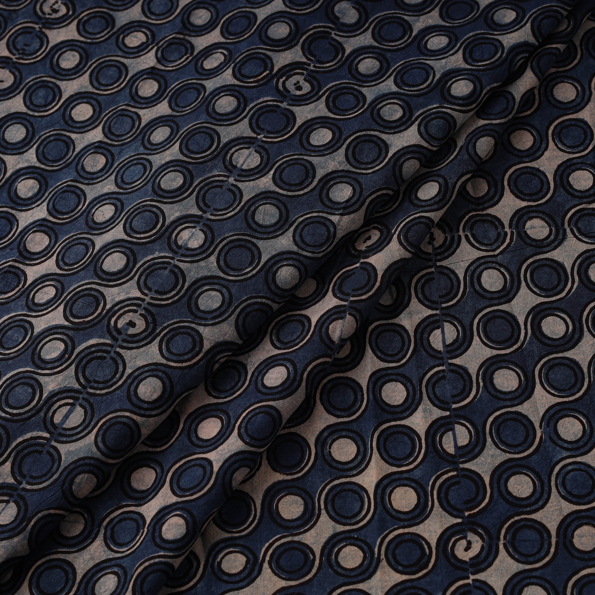 Ajrakh fabric by artisan Riyaz Abdulmajid Khatri is crafted using natural-dyeing and resist block-printing techniques. This ancient craft is estimated to be around 4,500 years old. The Ajrakh artisans in India originally migrated from Sindh to the Kutch region of Gujarat and to Barmer in Rajasthan. Ajrakh is also the traditional attire of the Maldhari pastoral community of Bhuj. The process is long and detailed, involving multiple stages where each layer of colour is printed only after a resting period, allowing the cloth to absorb the dye fully. Made from cotton, it is ideal for creating kurtas, shirts, dresses or even home decor items.