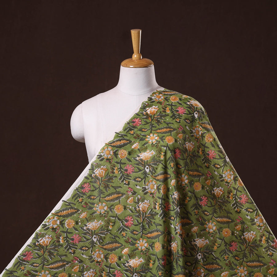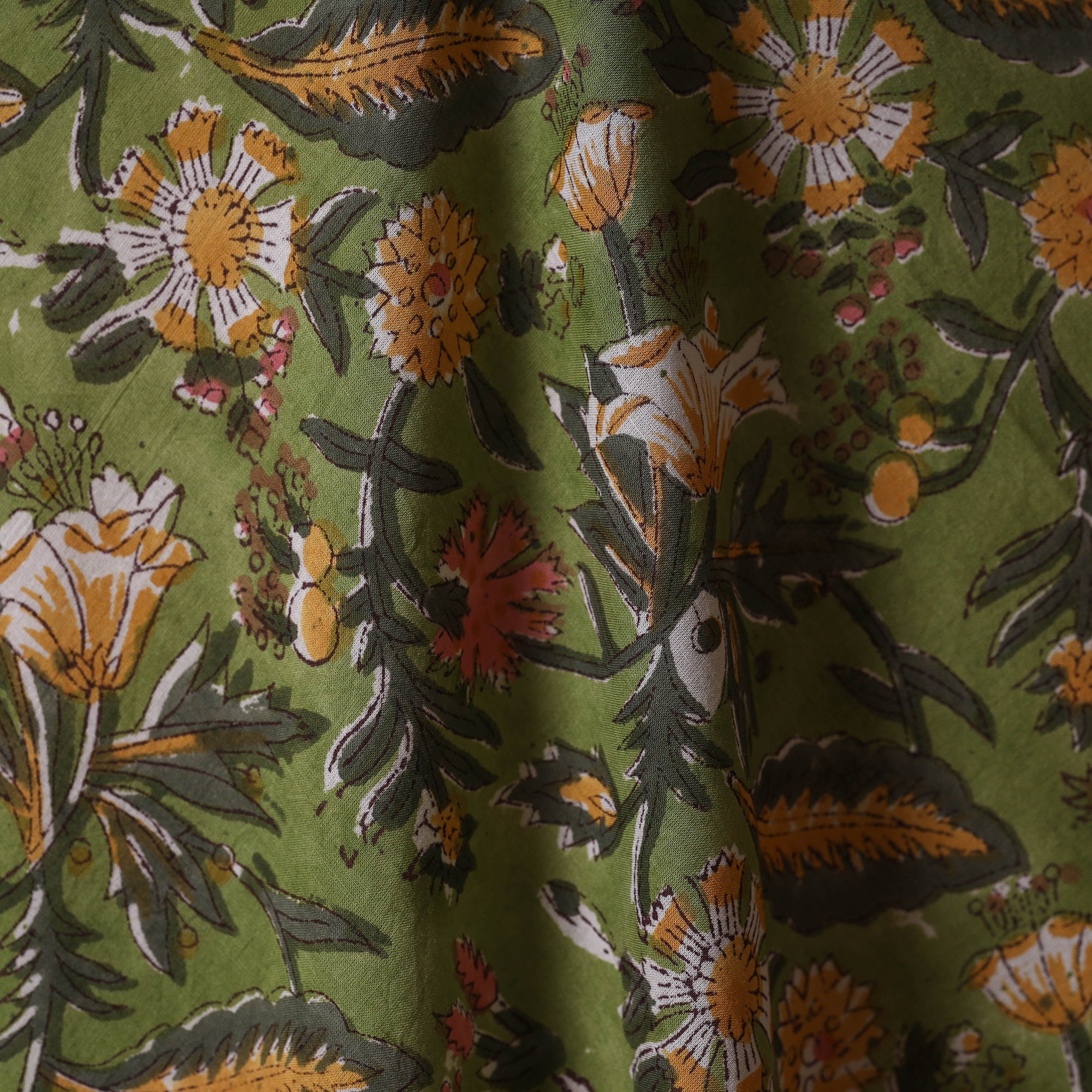 Green sanganeri hand block printed cotton fabric by artisans in Sanganer, Jaipur, it showcases delicate floral patterns created with traditional wooden blocks. The breathable lightweight pure cotton is ideal for making kurtas, dresses, tunics or even home decor items like cushions and curtains.