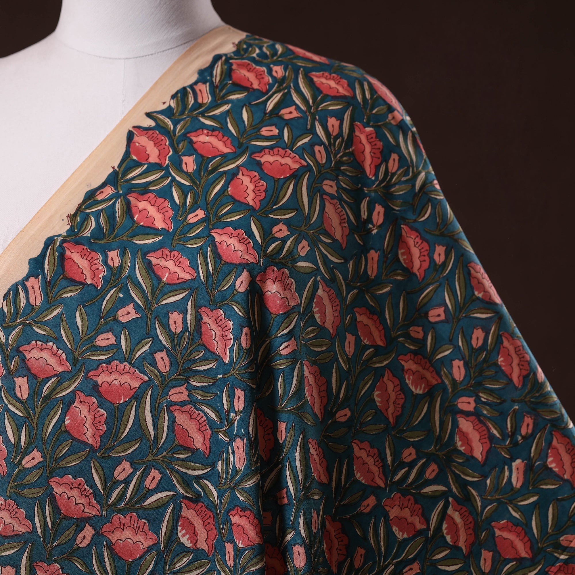 Blue sanganeri hand block printed cotton fabric by artisans in Sanganer, Jaipur, it showcases delicate floral patterns created with traditional wooden blocks. The breathable lightweight pure cotton is ideal for making kurtas, dresses, tunics or even home decor items like cushions and curtains.