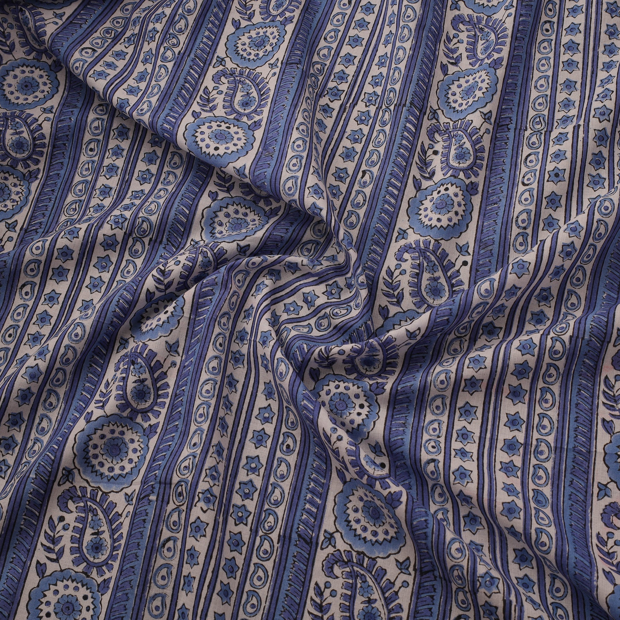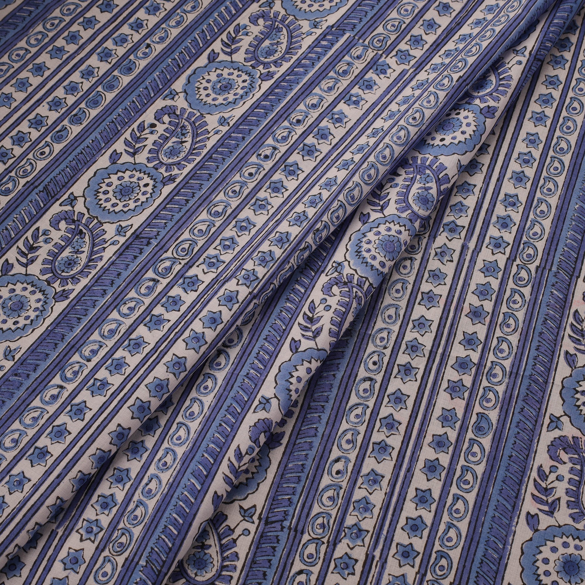 Blue hand block print sanganeri cotton fabric is created by skilled artisans in Sanganer, Rajasthan using traditional wooden blocks. This printing tradition is over 400 years old and has been passed down through generations. Made from breathable pure cotton, the fabric is well-suited for kurtas, dresses, tunics and home decor pieces like cushion covers and curtains.