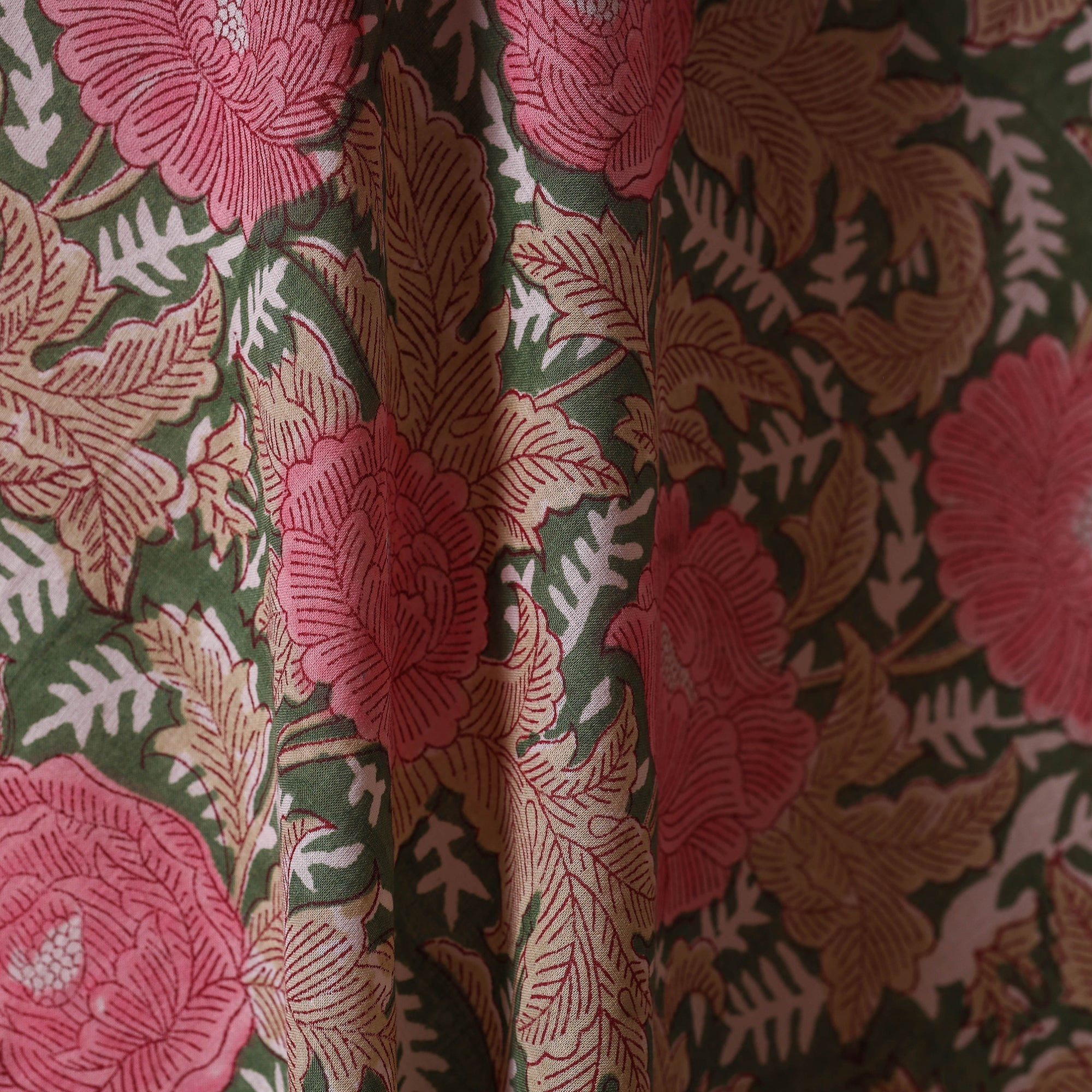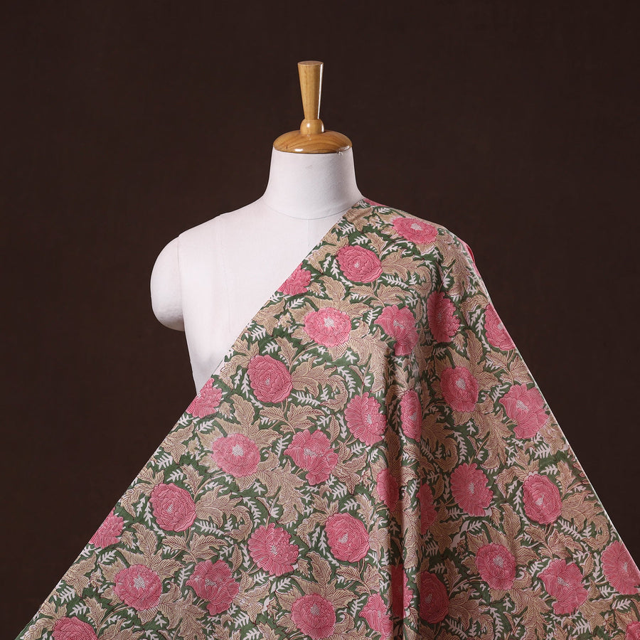Green sanganeri hand block printed cotton fabric by artisans in Sanganer, Jaipur, it showcases delicate floral patterns created with traditional wooden blocks. The breathable lightweight pure cotton is ideal for making kurtas, dresses, tunics or even home decor items like cushions and curtains.