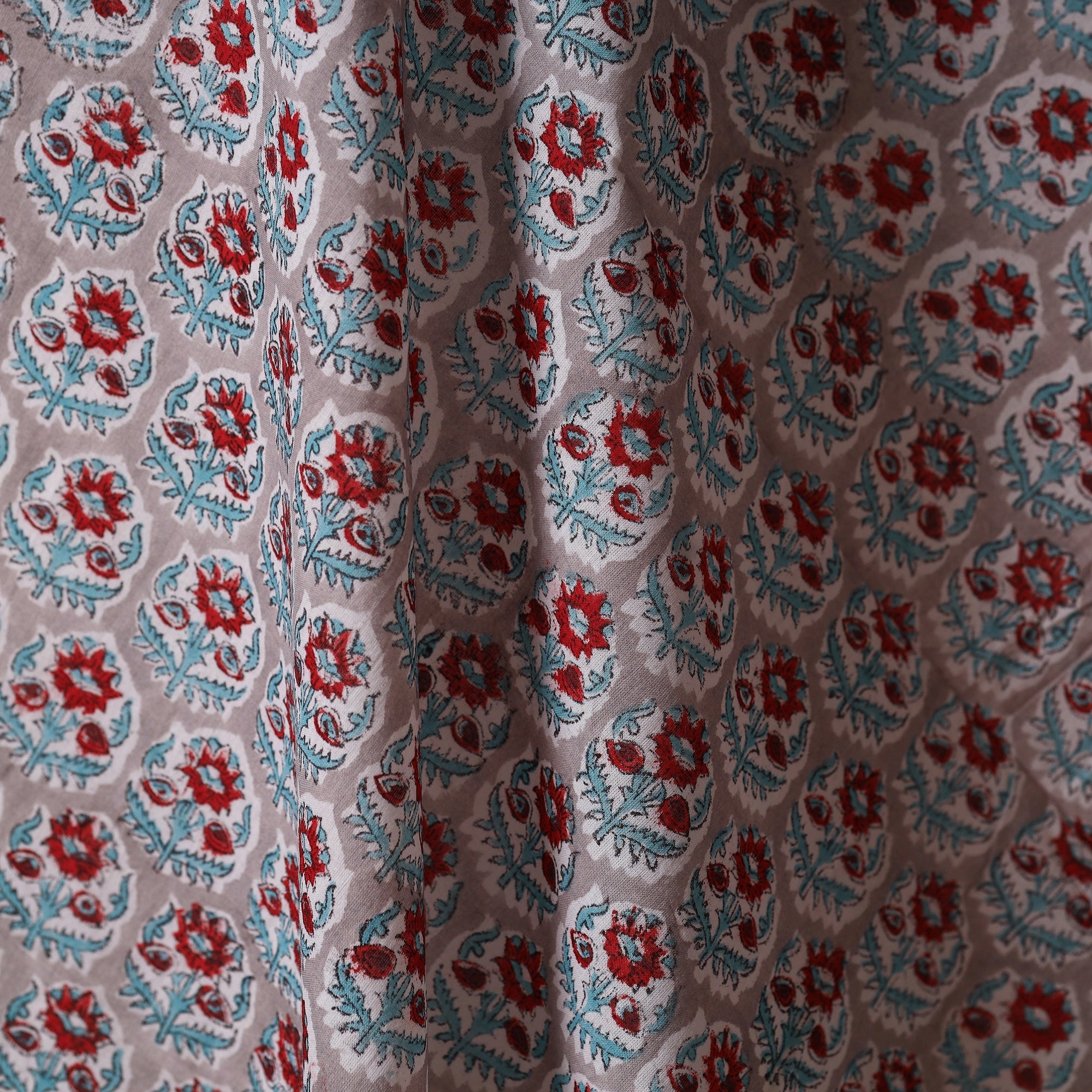 Grey sanganeri hand block printed cotton fabric by artisans in Sanganer, Jaipur, it showcases delicate floral patterns created with traditional wooden blocks. The breathable lightweight pure cotton is ideal for making kurtas, dresses, tunics or even home decor items like cushions and curtains.